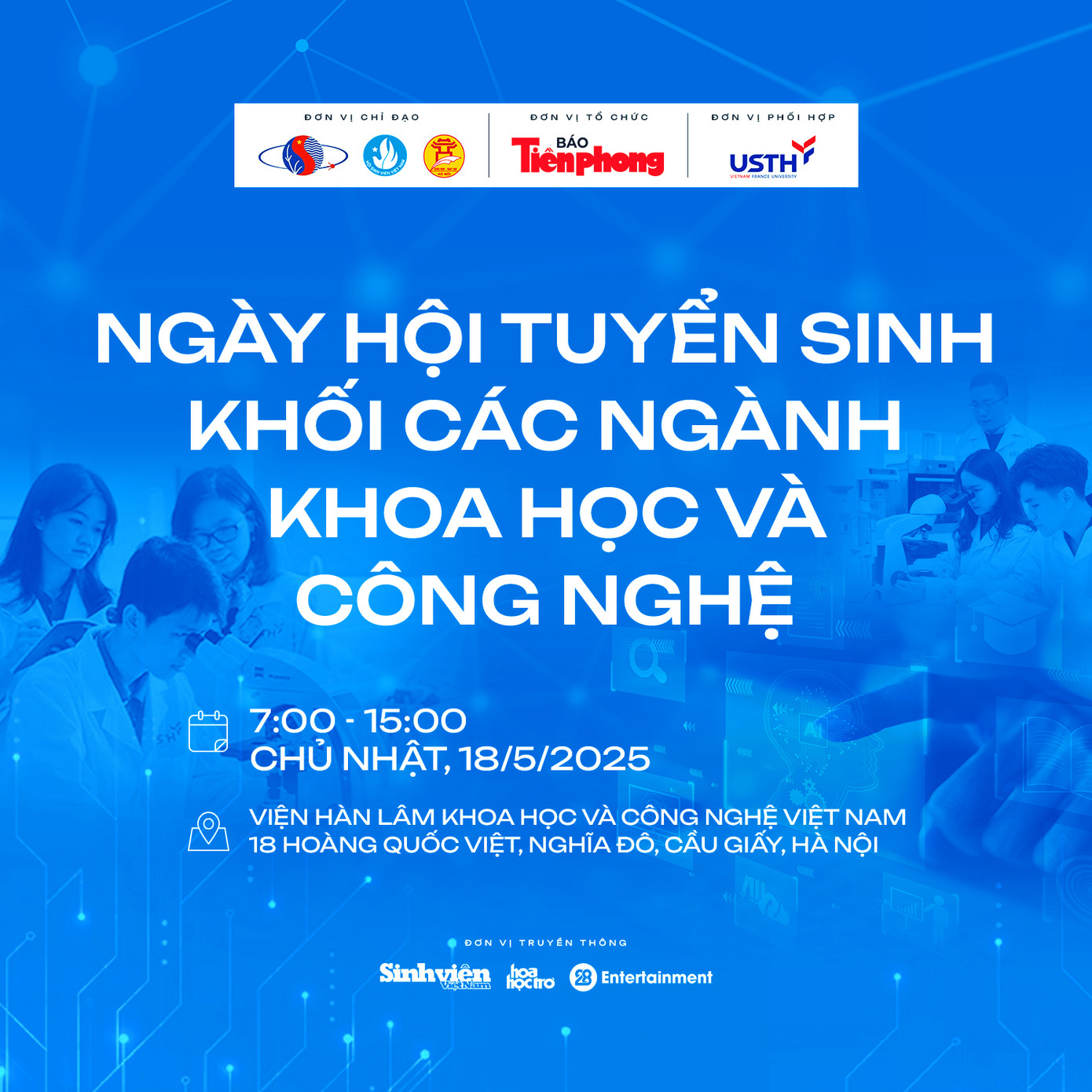 Ngày hội tuyển sinh khối các ngành Khoa học và Công nghệ do báo Tiền Phong tổ chức, dưới sự chỉ đạo và phối hợp của Viện Hàn lâm Khoa học và Công nghệ Việt Nam, T.Ư Hội Sinh viên Việt Nam, Sở GD&ĐT Hà Nội, Trường Đại học Khoa học và Công nghệ Hà Nội (USTH)...