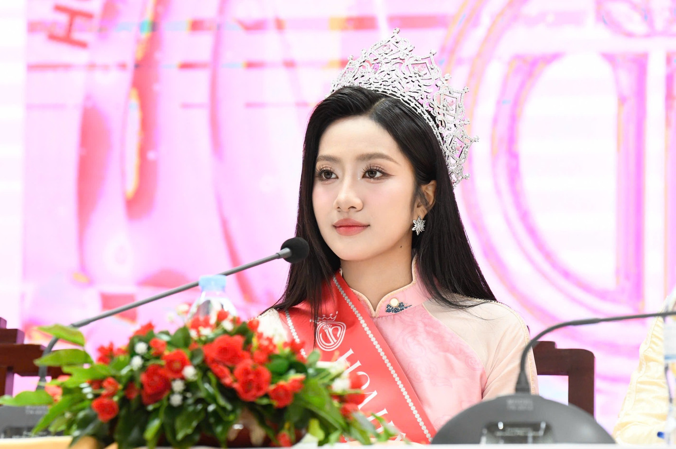 "Dạ thưa các anh chị, em rất lấy làm tiếc vì thời gian đã hết, em không có nhiều thời gian để chia sẻ với chị. Em rất cảm ơn, hy vọng có thể chia sẻ với chị ở dịp khác. Em xin cảm ơn quý đại biểu, các anh chị báo chí đã đến đây, cho chúng em có cơ hội chia sẻ, nói về hành trình thời gian qua. Cảm ơn mọi người quan tâm đến cuộc thi Hoa hậu Việt Nam. Lần nữa em xin trân trọng cảm ơn tất cả", Hoa hậu Hà Trúc Linh nói.
