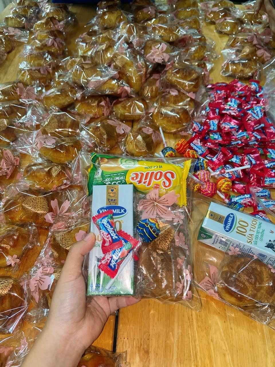 | Mỗi phần quà gồm lồng đèn, bánh, kẹo, sữa được trao tận tay đến các em. |