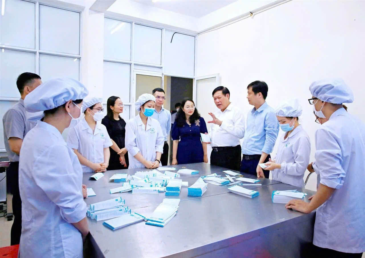 | TS. Trần Bá Kiên – Hiệu trưởng cùng Sinh viên tại Trung tâm Nghiên cứu và Kinh doanh Dược của trường. |