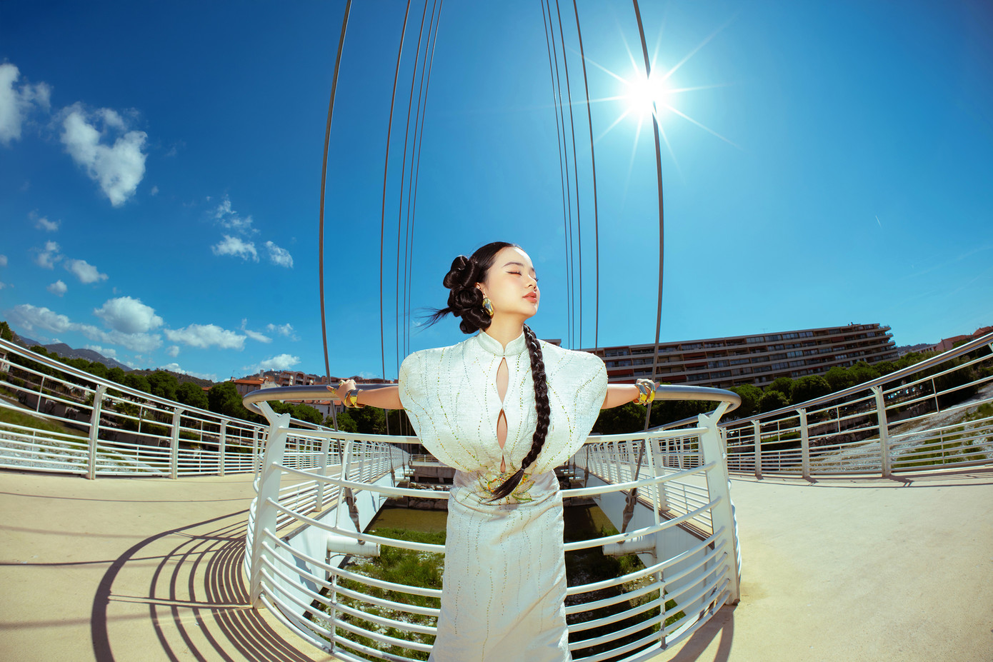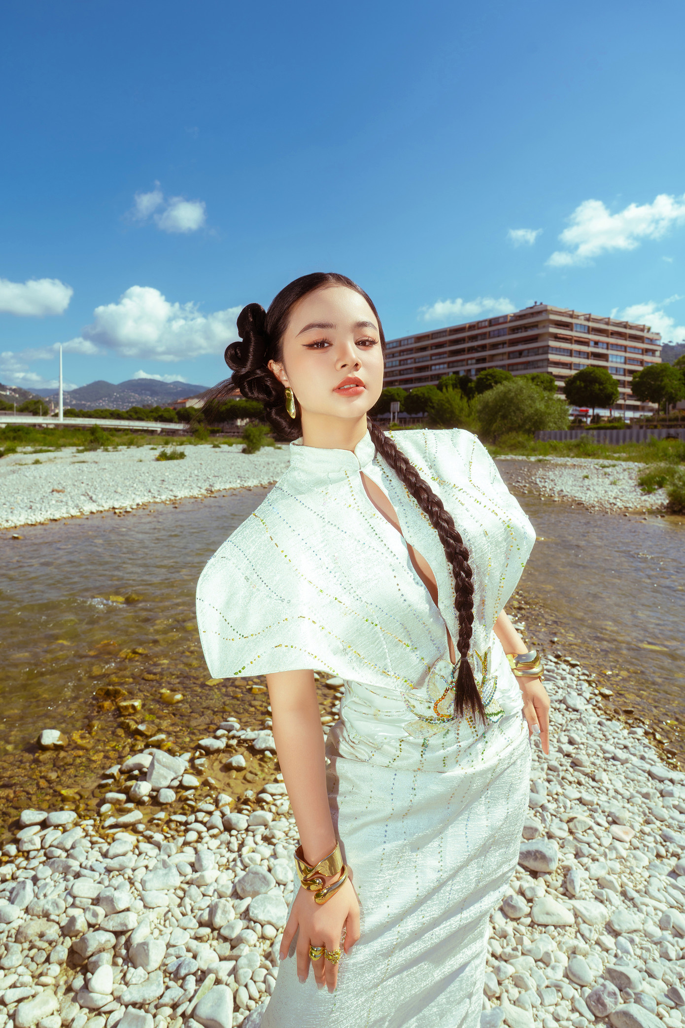 Điểm nhấn nổi bật nhất trong hành trình tại Cannes 2025 là khoảnh khắc Maika Ngọc Khánh diện thiết kế đầm cách tân từ áo yếm truyền thống Việt Nam, sải bước trên thảm đỏ. Chiếc đầm được thực hiện trong 60 ngày liên tục với kỹ thuật thêu tay thủ công, kết hợp những chi tiết hoa sen tinh xảo.