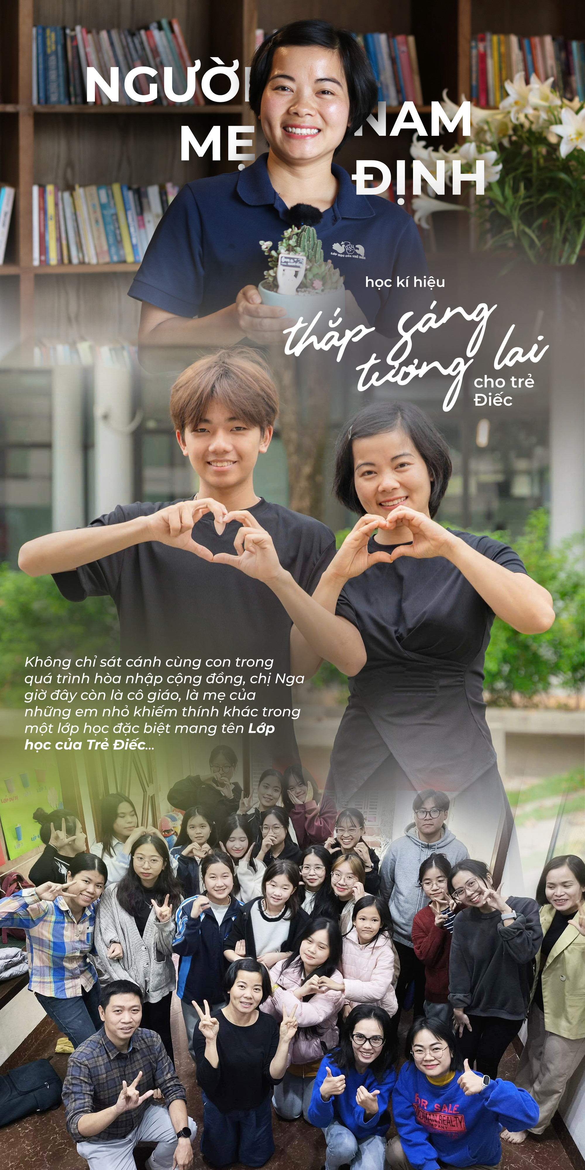 Không chỉ sát cánh cùng con trong quá trình hòa nhập cộng đồng, chị Nga giờ đây còn là cô giáo, là mẹ của những em nhỏ khiếm thính khác trong một lớp học đặc biệt mang tên Lớp học của Trẻ Điếc. Trong lớp học ấy, chị không chỉ truyền đạt kiến thức mà còn thắp lên niềm tin, sự tự tin và hy vọng cho những đứa trẻ khiếm thính, giúp các em từng bước vươn tới một tương lai tươi sáng hơn…