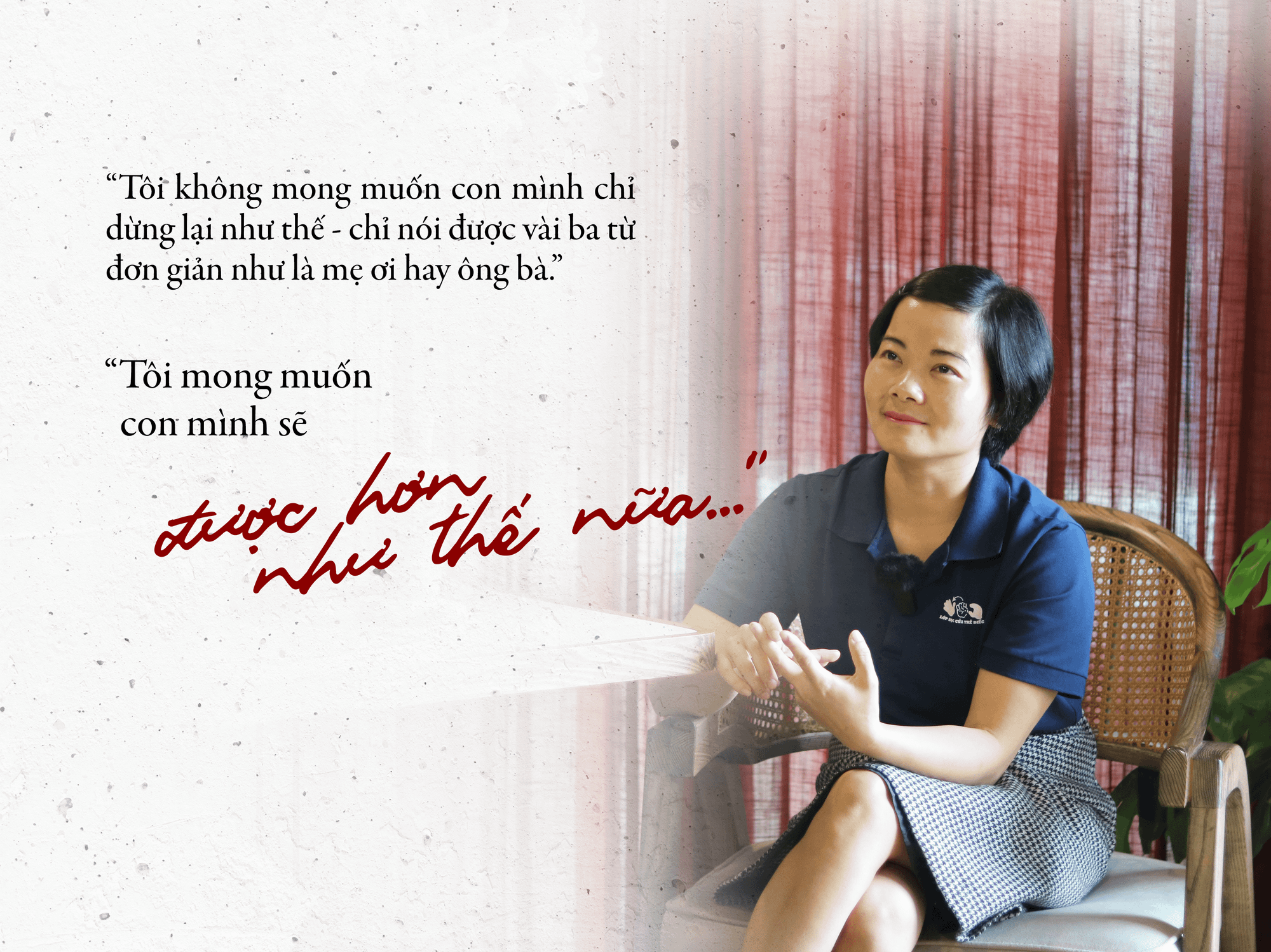 Tôi và các thầy cô ở lớp học cũng rất mong lớp học có thể được phát triển, được nhiều người quan tâm hơn, để các bạn điếc có nhiều cơ hội hơn, để các bạn có cơ hội được học, học bằng phương pháp phù hợp với bản thân mình. Tôi cũng mong nhà nước sẽ có những chính sách quan tâm đến các bạn điếc hơn, các bạn điếc sẽ có trường đại học dành cho trẻ điếc hoặc các trường đại học sẽ có những chính sách để hỗ trợ, nhận những học sinh điếc vào học, để các bạn ấy có cơ hội được phát triển, được học tập và làm chủ tương lai của mình.
