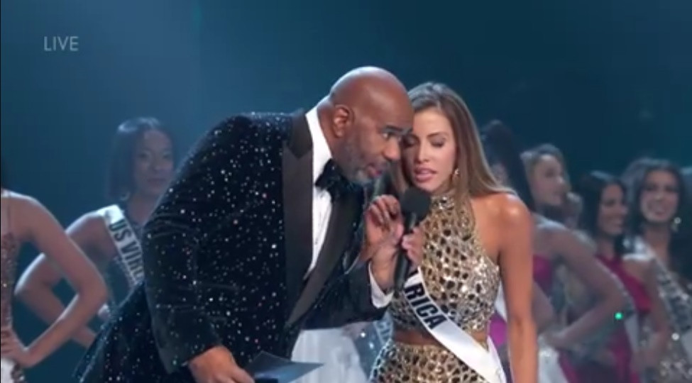 MC Steve Harvey đã đặt câu hỏi cho người đẹp đại diện Costa Rica - Natalia Carvajal: "Cô là host một chương trình truyền hình tại quốc gia của mình. Vậy với tư cách là những người đồng nghiệp, cô có lời khuyên nào cho tôi không?". Natalia Carvajal ngay lập tức trả lời: "Tôi thấy anh đang làm rất tốt. Nhưng để đề phòng, tôi nói với anh điều này nhé! Lại gần đây nào, tôi không muốn mọi người nghe thấy... Nếu họ đưa cho anh một phong bì vô cùng, vô cùng, vô cùng quan trọng, hãy cố gắng đọc kỹ, OK?".