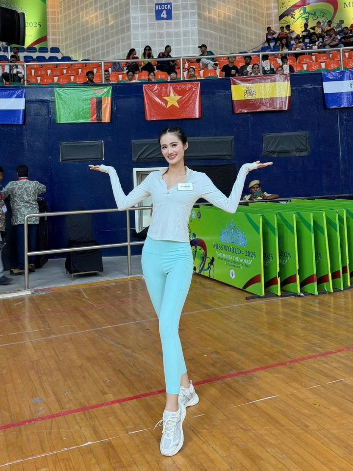 Bộ trang phục thể thao đầu tiên của Hoa hậu Ý Nhi tại Miss World 2025 được nàng hậu mặc trong buổi tập luyện cho lễ Khai mạc cuộc thi Hoa hậu Thế giới lần thứ 72.