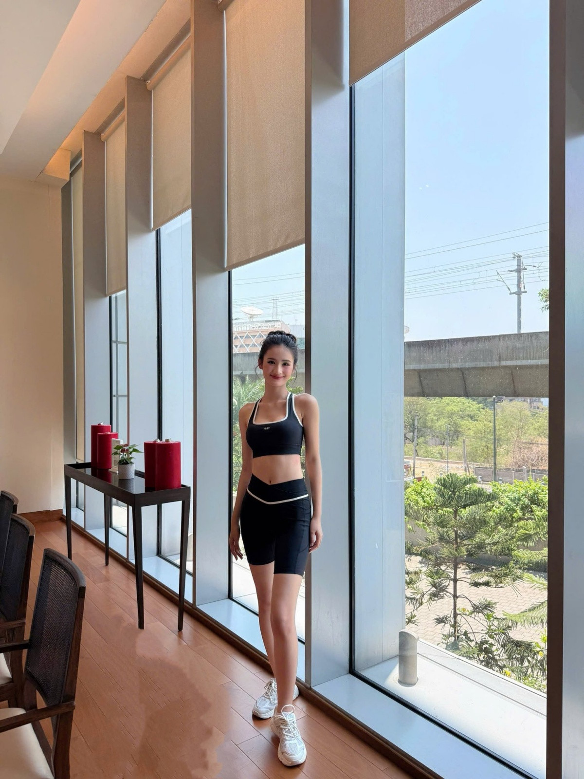 Set đồ thể thao gần đây nhất được Ý Nhi khoe trên trang cá nhân là một thiết kế màu xanh đậm, tiếp tục giúp nàng hậu khoe vòng eo nhỏ xíu. Đây là set đồ được người đẹp mặc trong buổi tập luyện đầu tiên cho đêm Chung kết Miss World 2025.
