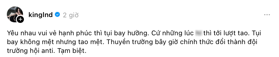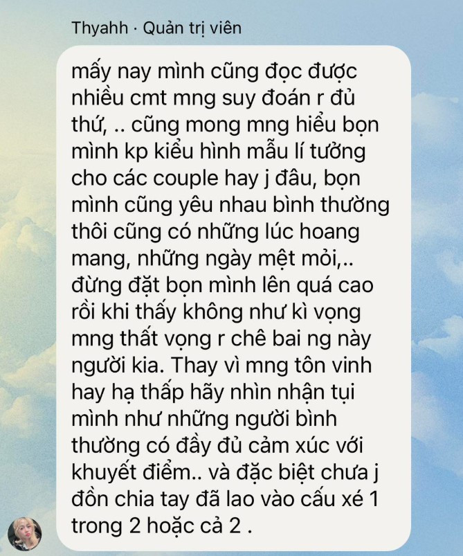 “Mấy nay mình cũng đọc được nhiều comment mọi người suy đoán rồi đủ thứ... cũng mong mọi người hiểu bọn mình không phải kiểu hình mẫu lí tưởng cho các couple hay gì đâu, bọn mình cũng yêu nhau bình thường thôi cũng có những lúc hoang mang, những ngày mệt mỏi...