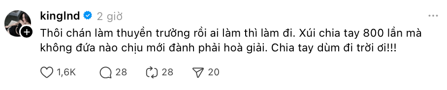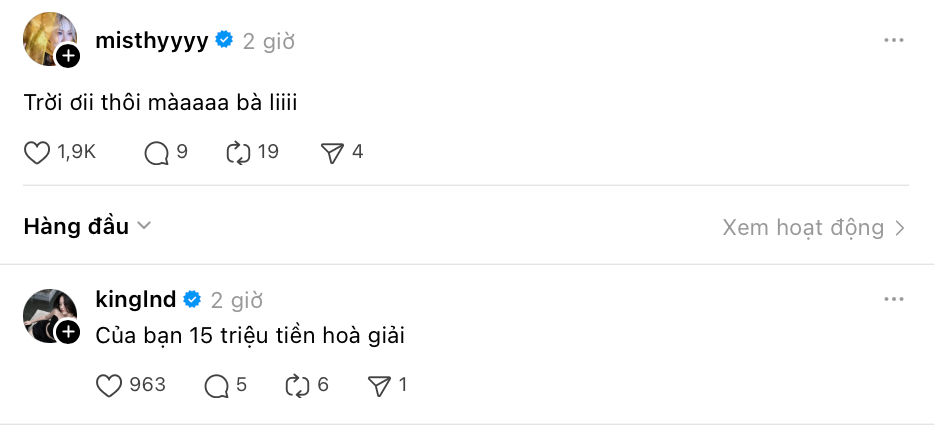 Liên quan đến chuyện tình cảm của Misthy và Bank, mới đây Linh Ngọc Đàm đã có bài đăng trên Threads thể hiện thái độ "giận dỗi" khi cặp đôi gặp trục trặc. Cô nàng là người đứng ra hòa giải, hàn gắn cặp đôi. Nữ streamer sinh năm 1996 còn đùa vui rằng "tiền hòa giải của bạn là 15 triệu". Dưới bài đăng, fan của cặp đôi liên tục gửi lời cảm ơn tới Linh Ngọc Đàm.
