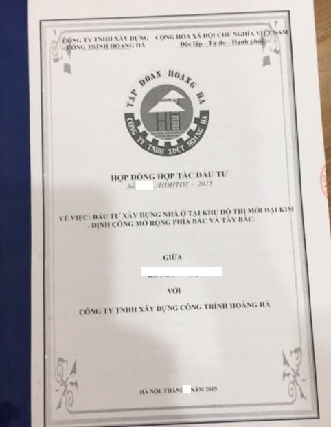 Cụ thể, tại “Hợp đồng hợp tác đầu tư” mà Công ty TNHH Xây dựng công trình Hoàng Hà do ông Hoàng Văn Lâm Giám đốc công ty đã ký với khách hàng hồi tháng 9/2015 nêu rõ. “Bên A (người mua) đồng ý hợp tác với bên B (Công ty TNHH Xây dựng công trình Hoàng Hà) để đầu tư xây dựng nhà ở tại dự án Khu đô thị mới mở rộng phía Bắc và Tây Bắc Đại Kim - Định Công theo quy hoạch được duyệt tại ô đất nhà vườn căn số 5 có diện tích tạm tính là 117m2- phía Tây lô mặt đường 2,5 với giá hơn 7 tỷ đồng với tiến độ thanh toán chia thành 4 đợt…