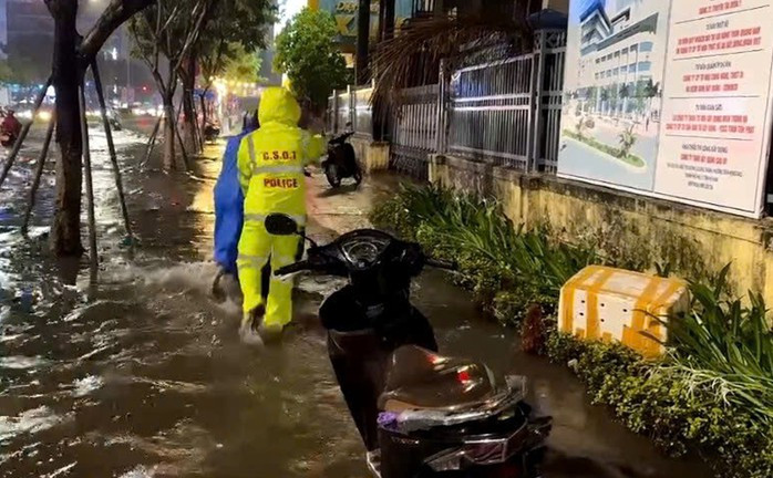 | Lực lượng CSGT Công an TP Đà Nẵng hỗ trợ người dân di chuyển trên các tuyến đường bị ngập nặng |