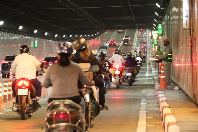 Đến 12 giờ cùng ngày, giao thông qua hầm vẫn bị ùn tắc, xe di chuyển chậm chạp để vào trung tâm TP HCM..