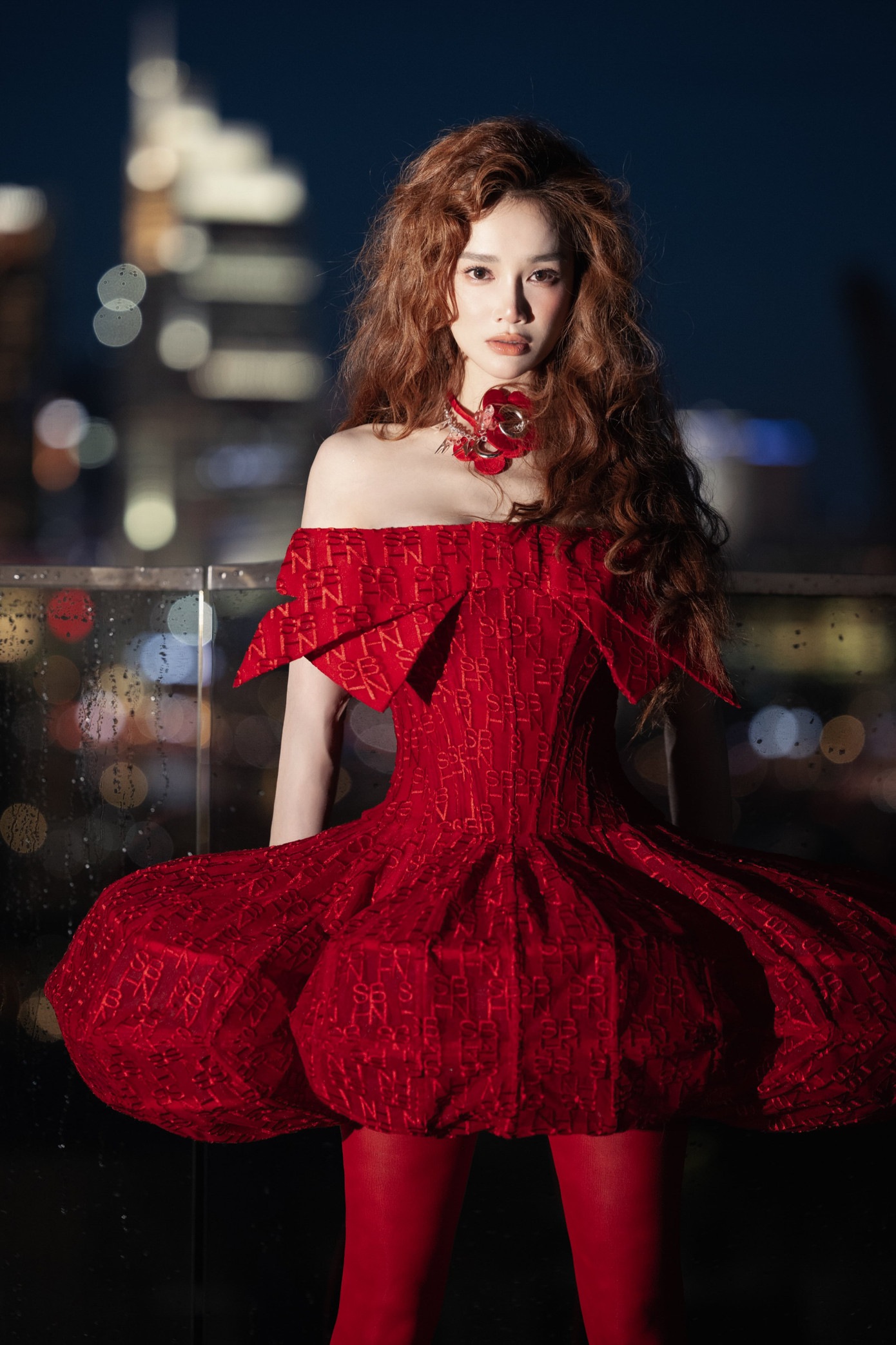 Diện chiếc đầm đỏ thiết kế đặc biệt và chiếc nơ to kết hợp cùng phụ kiện bông hoa xinh xắn khiến Nhã Phương trở nên nổi bật giữa không gian sang trọng. Nhã Phương tận dụng tối đa không gian tại đây để tạo nên những góc chụp và kiểu ảnh vô cùng sáng tạo và nghệ thuật.