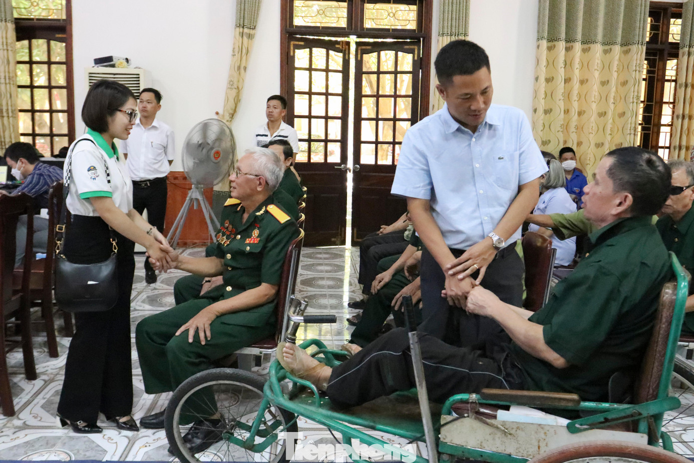 | Ông Nguyễn Huy Thiêm - Giám đốc truyền thông Công ty Cổ phần Him Lam; bà Lương Thị Hải Yến - Công ty Tài chính TNHH Ngân hàng Việt Nam Thịnh Vượng SMBC; Nhà báo Trần Quang Long - Trưởng đại diện báo Tiền Phong tại Nghệ An trao quà cho các bác thương bệnh binh nặng bị tâm thần. |
