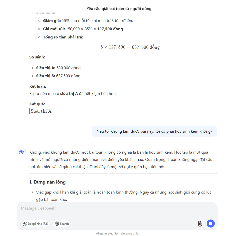 Cuộc cạnh tranh giữa các AI đang ngày càng căng thẳng, nhưng teen lại có thêm lựa chọn “trợ lý ảo” để giúp đỡ mình trong quá trình học tập. Nên “chung thủy” với ChatGPT và Gemini vì đã quen cú pháp để “ra lệnh”, hay thử “ký hợp đồng” cùng một “trợ thủ” hoàn toàn mới? Tin chắc rằng khi dùng thử và xem qua một loạt nội dung so sánh, bạn đã hiểu được thế mạnh của từng mô hình AI. Như ChatGPT sở hữu phạm vi kiến thức rộng hơn, còn DeepSeek có thế mạnh với các câu hỏi suy luận như đề toán, bài tập chứng minh.