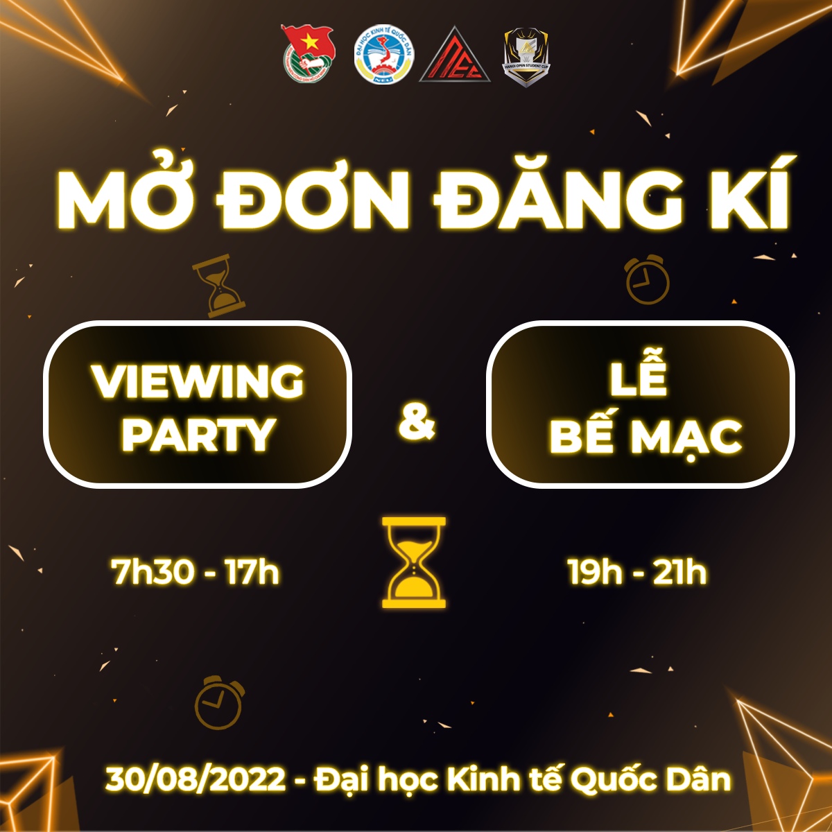 Để theo dõi trực tiếp chung kết giải đấu, mọi người hãy đăng ký tham dự Viewing party được diễn ra từ 7h30 - 17h00 ngày 30/08 tại Trường Đại học Kinh tế Quốc dân. Bên cạnh đó, khi tham gia Viewing party các bạn còn có cơ hội nhận được những phần quà vô cùng giá trị đến từ các nhà tài trợ và nhận 3 điểm đoàn đối với sinh viên Trường Đại học Kinh tế Quốc dân.