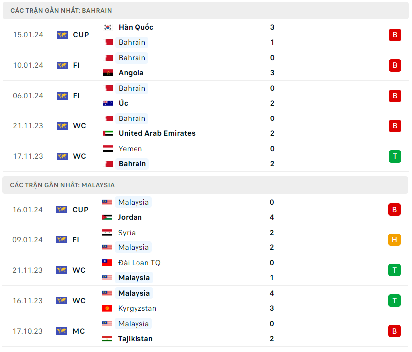 Lịch sử đối đầu, phong độ Bahrain vs Malaysia