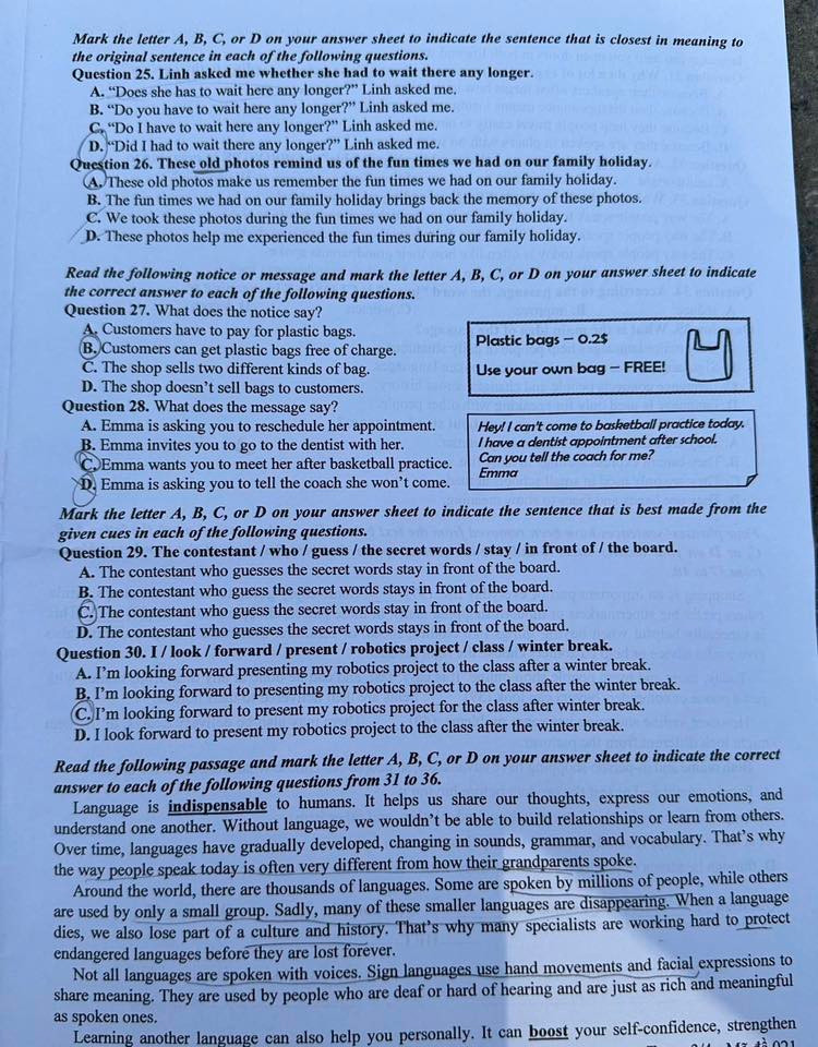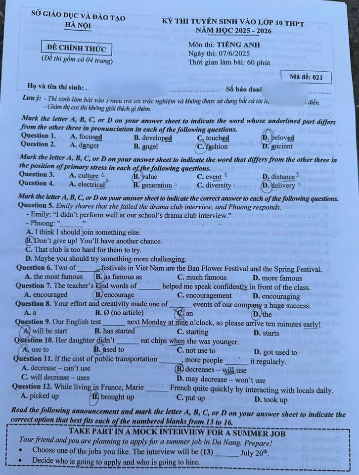 Theo Sở GD&ĐT Hà Nội, đề thi được xây dựng với định hướng đánh giá năng lực sử dụng tiếng Anh thực tế của học sinh, không quá đánh đố nhưng vẫn có tính phân loại rõ rệt.