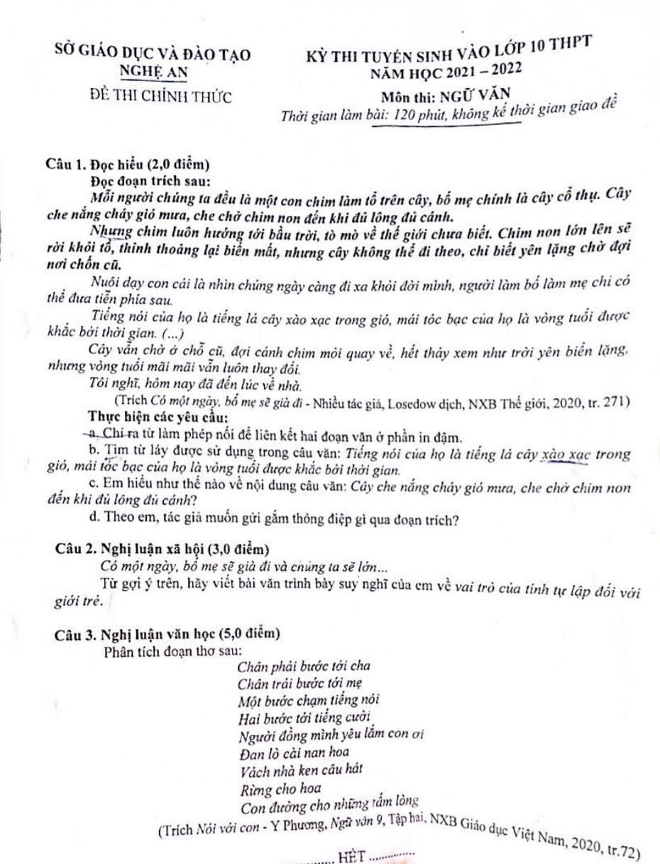 Đề thi môn Ngữ văn vào lớp 10 năm nay của tỉnh Nghệ An được đánh giá hay, hoàn toàn có thể hình thành một trục chủ đề xuyên suốt là “Bóng cả yêu thương”, độ phân hoá đạt yêu cầu, đáp ứng được mục đích của một kì thi tuyển sinh, phổ điểm có thể rơi vào mức 6 - 7 điểm.