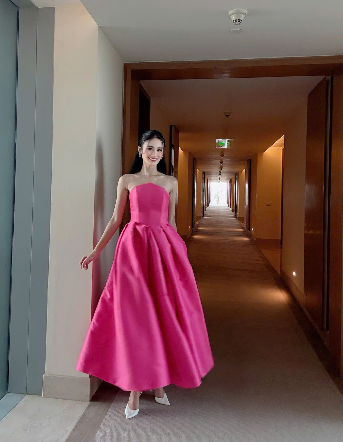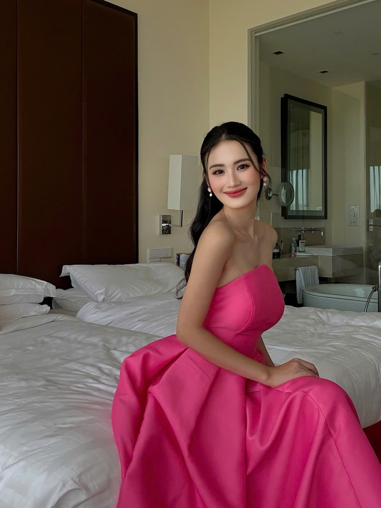 Ý Nhi đã đến thành phố Hyderabad, bang Telangana của Ấn Độ để tham dự Miss World 2025. Cô diện thiết kế cổ điển với tông màu hồng nổi bật, dáng cúp ngực tôn lên bờ vai và xương quai xanh thanh thoát. Chân váy xếp ly giúp Ý Nhi thêm phần thanh lịch, sang trọng.