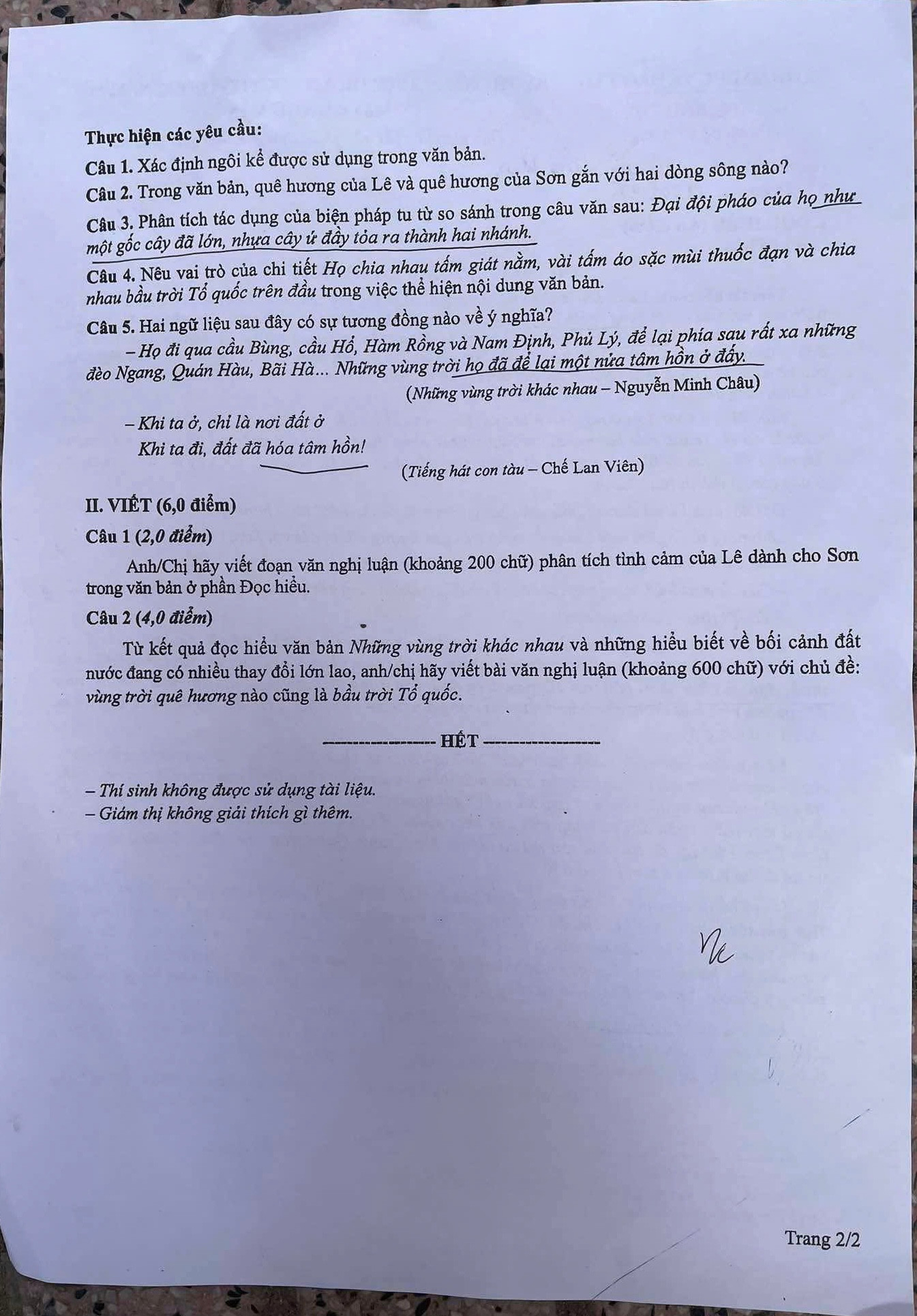 | II. VIẾT (6,0 điểm) | Câu 1. (2 điểm) | a. Bảo đảm yêu cầu về hình thức, dung lượng của đoạn văn. b. Xác định đúng vấn đề cần nghị luận: Tình cảm Lê dành cho Sơn. c. Viết đoạn văn bảo đảm các yêu cầu: Lựa chọn các thao tác lập luận phù hợp, kết hợp chặt chẽ giữa lí lẽ và dẫn chứng, trình bày ý phù hợp theo bố cục của đoạn văn nghị luận. Bài làm có thể triển khai theo nhiều cách, sau đây là gợi ý: 1. Mở đoạn: Giới thiệu tác giả, tác phẩm và vấn đề nghị luận: tình cảm của Lê dành cho Sơn. 2. Thân đoạn: * Khái quát ngắn gọn về hoàn cảnh gặp gỡ hai nhân vật. * Sự thay đổi trong nhận thức của Lê về Sơn: - Ban đầu: Định kiến với Sơn (công tử Hà Nội, "trắng trẻo", xa lạ với chiến trường). - Sau ba năm: trở thành người đồng đội thân thiết. * Tình cảm Lê dành cho Sơn: - Tình cảm gắn bó: + Cùng nhau trải qua gian khổ chiến tranh. + Cùng mang một sứ mệnh thiêng liêng, cao cả. + Coi nhau là "đồng chí thân thiết nhất trong đời lính". - Nỗi nhớ, sự tin tưởng khi xa cách: + Lê ở Hà Nội nhưng luôn nhớ về Sơn đang chiến đấu nơi quê mình. + Hình ảnh Sơn trở thành điểm tựa tinh thần, gắn với ký ức về trận địa, dòng sông Lam. + Họ có tinh thần trách nhiệm với quê hương. - Đánh giá chung về nghệ thuật: Ngôi kể thứ ba; Các hình ảnh biểu tượng tạo chiều sâu cảm xúc; Giọng điệu … 3. Kết đoạn: Khẳng định lại tình cảm của Lê dành cho Sơn và giá trị của tình bạn, tình đồng chí |