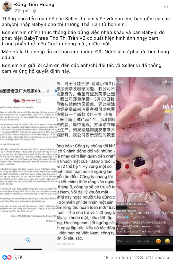Trong bài đăng của mình, ViRusS nhấn mạnh: "Thông báo đến toàn bộ các Seller đã làm việc với bọn em, bao gồm cả các anh/chị nhập Baby Three cho thị trường Thái Lan từ bọn em.