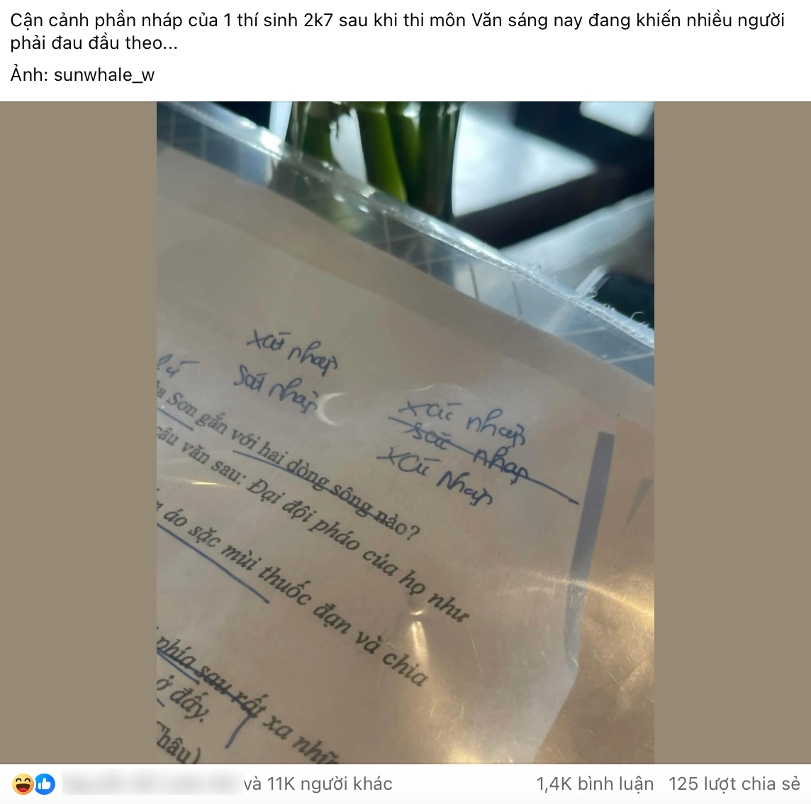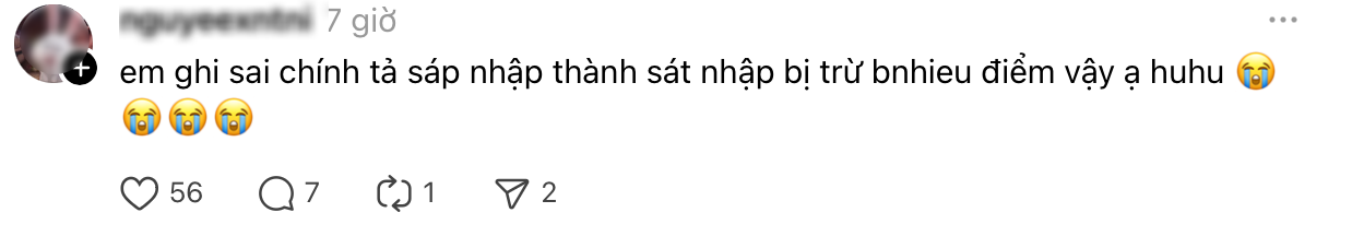 Chỉ vài giờ sau khi kết thúc buổi thi, trên TikTok và Facebook đã xuất hiện hàng loạt bài đăng hài hước với nội dung như: “Tỉnh táo cả bài đến đoạn sáp nhập thì… thôi rồi"; “Viết cả trang nói về sáp nhập tỉnh mà giờ mới phát hiện mình viết sát nhập”... Nhiều bài đăng nhận được hàng chục nghìn lượt tương tác, cho thấy mức độ phổ biến của lỗi sai này.