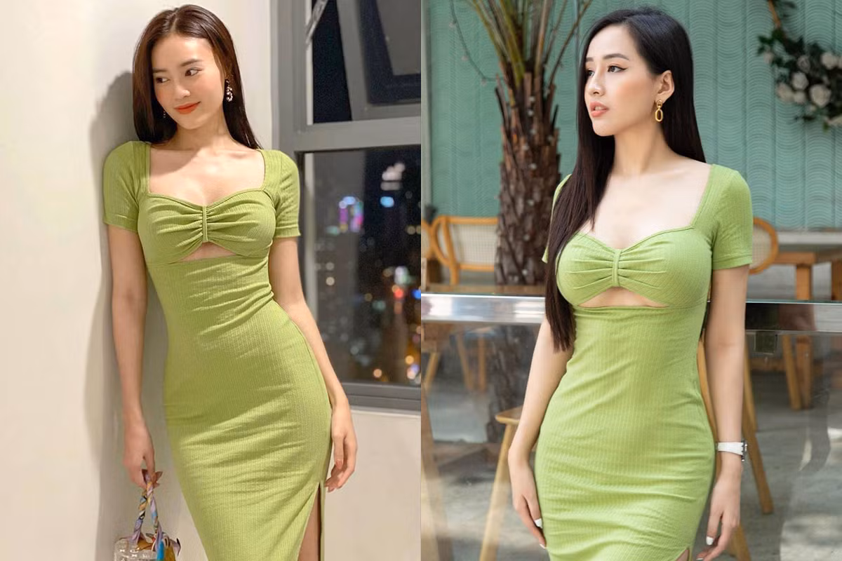 Thật không ngờ lại có ngày một cô gái mình hạc xương mai như Lan Ngọc và nàng Hoa hậu vóc dáng đáng nể Mai Phương Thúy lại đụng hàng một mẫu váy ôm sát. Khoảng trống tam giác ngay dưới chân ngực giúp hai mỹ nhân đều khoe khéo vòng 1 đầy đặn.