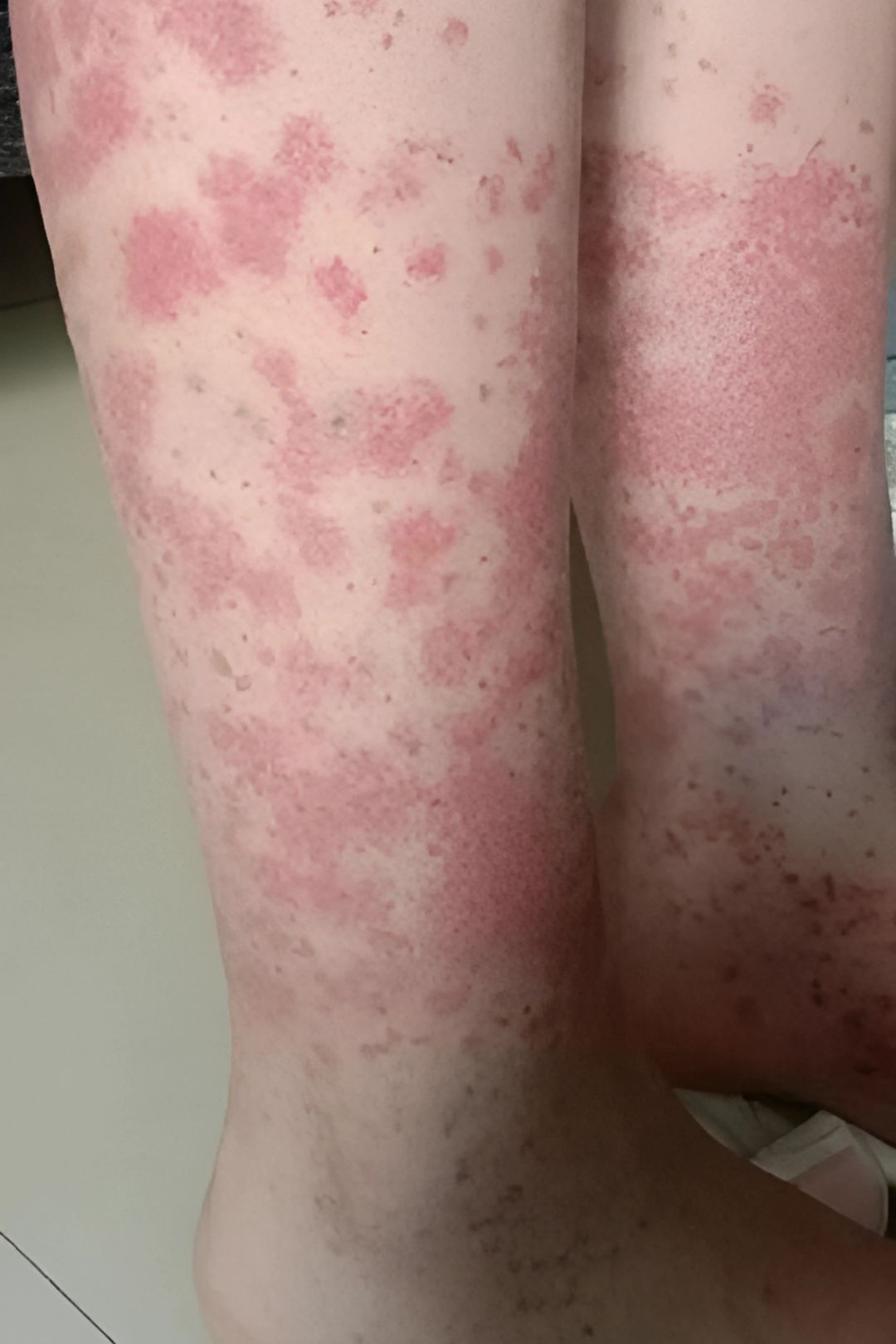 Vào tháng 5, sau khi nhuộm tóc, Tiểu Lâm phát hiện hai chân nổi nhiều đốm đỏ li ti. Ban đầu, cô tưởng chỉ là vết muỗi đốt. Nhưng trong một tuần, các đốm đỏ lan khắp người, kèm theo đau bụng, đau khớp, nước tiểu chuyển màu nâu.
