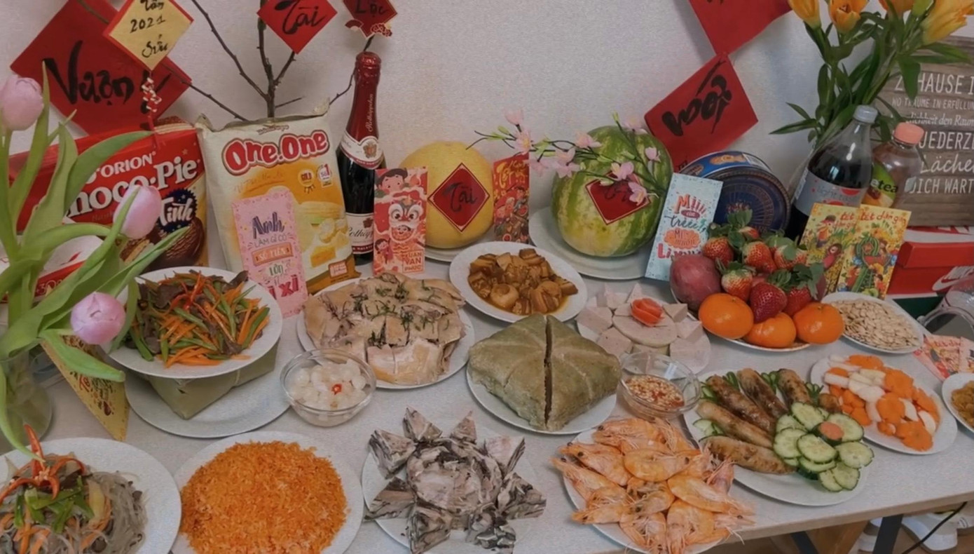 | Mâm cơm tất niên Lan Anh cùng các bạn du học sinh Việt tại Đức chuẩn bị để nhớ về hương vị Tết quê nhà. |