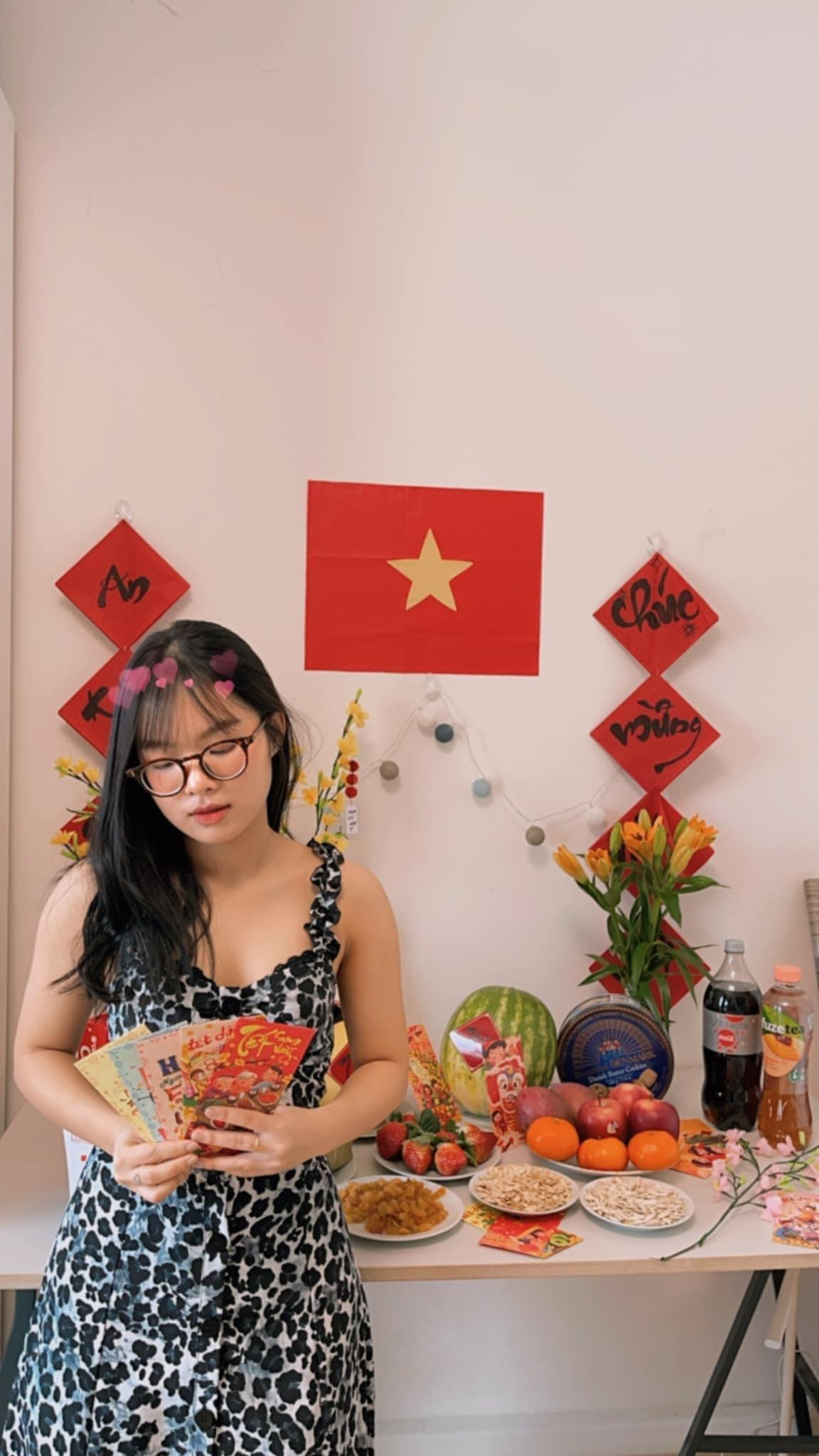 Cô nói: “Tầm này mọi năm khi còn ở nhà, mình thường cùng mẹ đi chợ sắm đồ Tết, gói bánh chưng cùng bà ngoại và đi mua cây quất cùng bố. Năm nay lướt Facebook thấy các bạn ở quê nhà chia sẻ thành quả dọn dẹp nhà cửa hoặc ‘khoe’ thành tích gói bánh chưng khiến những người xa quê như mình càng cảm thấy nao lòng vì nhớ nhà.”