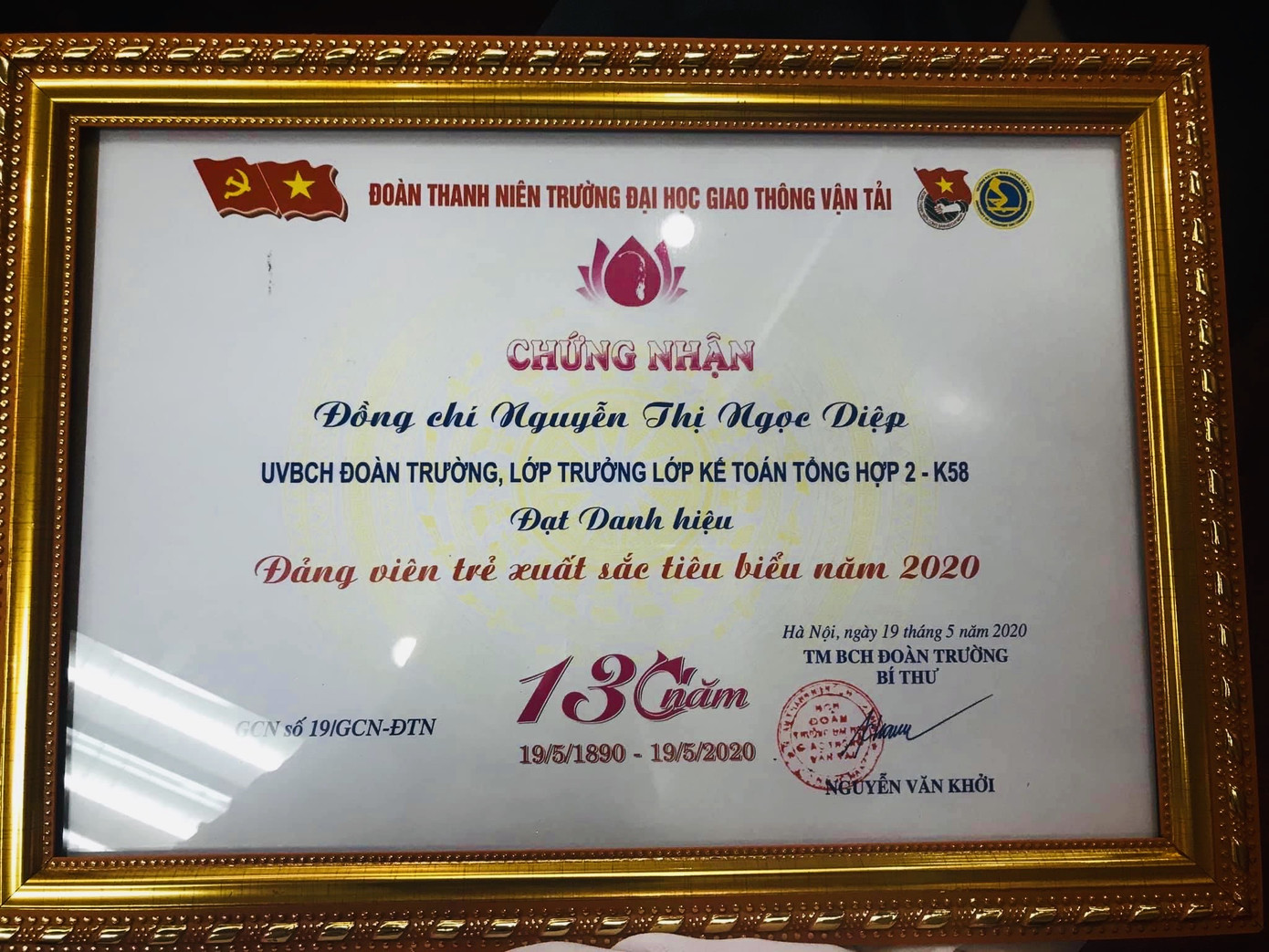 + Được nhận chứng nhận “Đảng viên trẻ xuất sắc tiêu biểu” năm 2020 của trường nhân kỉ niệm 130 năm ngày sinh nhật Bác.