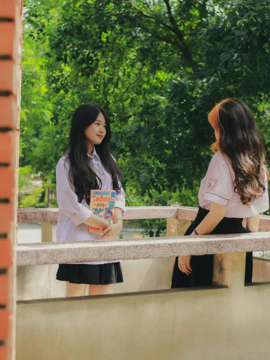 | Lan Anh trong bộ đồng phục với áo sơ trắng, chân váy xanh tím than, trong ngày nhận giải thưởng “Sinh viên 5 tốt” cấp trường. |