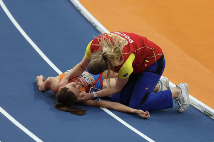 | Maureen Koster được chăm sóc y tế (bên phải) trong khi chung kết nội dung 3.000m nữ vẫn tiếp tục. |