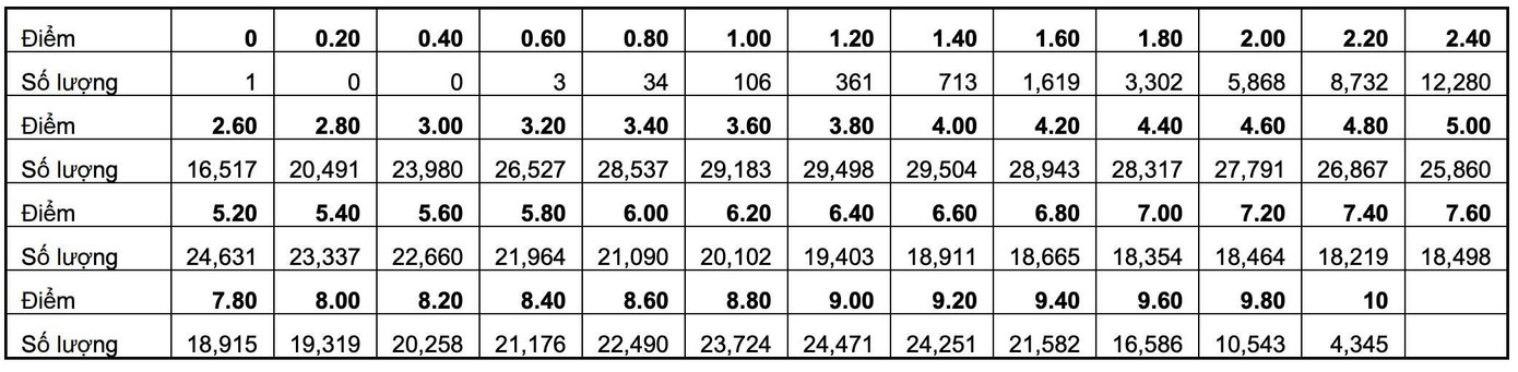 Đặc biệt, điểm thi tốt nghiệp THPT môn tiếng Anh năm nay khác biệt khi xuất hiện 2 đỉnh tích điểm trong cùng một phổ điểm. Đỉnh thứ nhất với khoảng tích điểm là 4 - 5 điểm, đỉnh thứ 2 là khoảng 7 - 8 điểm.