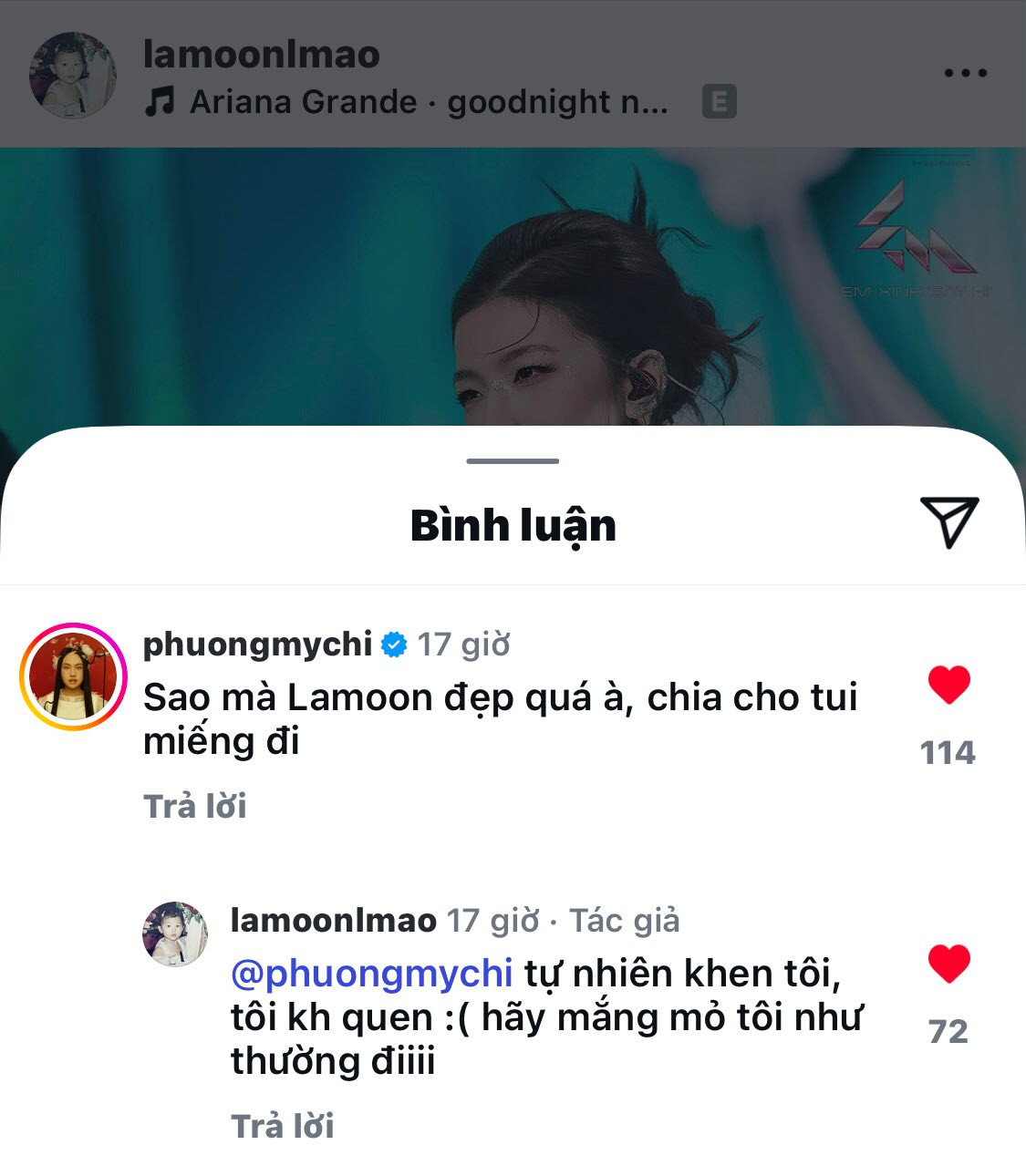 Trong hậu trường tập luyện, Lamoon thường xuyên "bám lấy" Phương Mỹ Chi, tạo nên hình ảnh đôi bạn “gắn như keo” dễ thương. Không chỉ ăn ý trên sân khấu, ngoài đời hai cô bạn đồng niên cũng có vô vàn khoảnh khắc thân thiết.