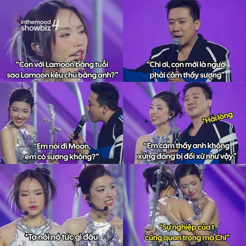 Khoảnh khắc viral nhất giữa hai cô bạn là khi bị đẩy vào thế khó, đứng giữa "hai chiến tuyến” trong câu chuyện xưng hô với Trấn Thành. Trong khi Phương Mỹ Chi nhất quyết giữ quan điểm gọi “chú” như từ bé đến giờ, thì Lamoon lại đứng về phía nam MC: “Em thấy anh không đáng bị Phương Mỹ Chi đối xử như vậy”.