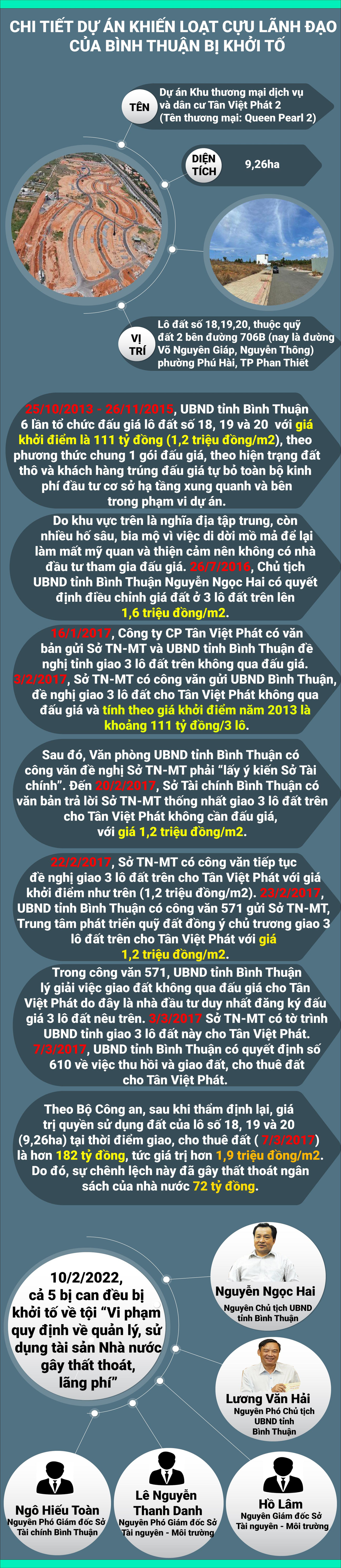 TPO - 3 lô đất có tổng diện tích khoảng 92.600m2 (9,26ha) được giao cho Công ty CP Tân Việt Phát thực hiện dự án Khu thương mại dịch vụ và dân cư Tân Việt Phát 2 (Queen Pearl 2) không qua đấu giá vào năm 2017, nhưng tỉnh Bình Thuận lại áp giá đất năm 2013, gây thiệt hại ngân sách 72 tỷ đồng.