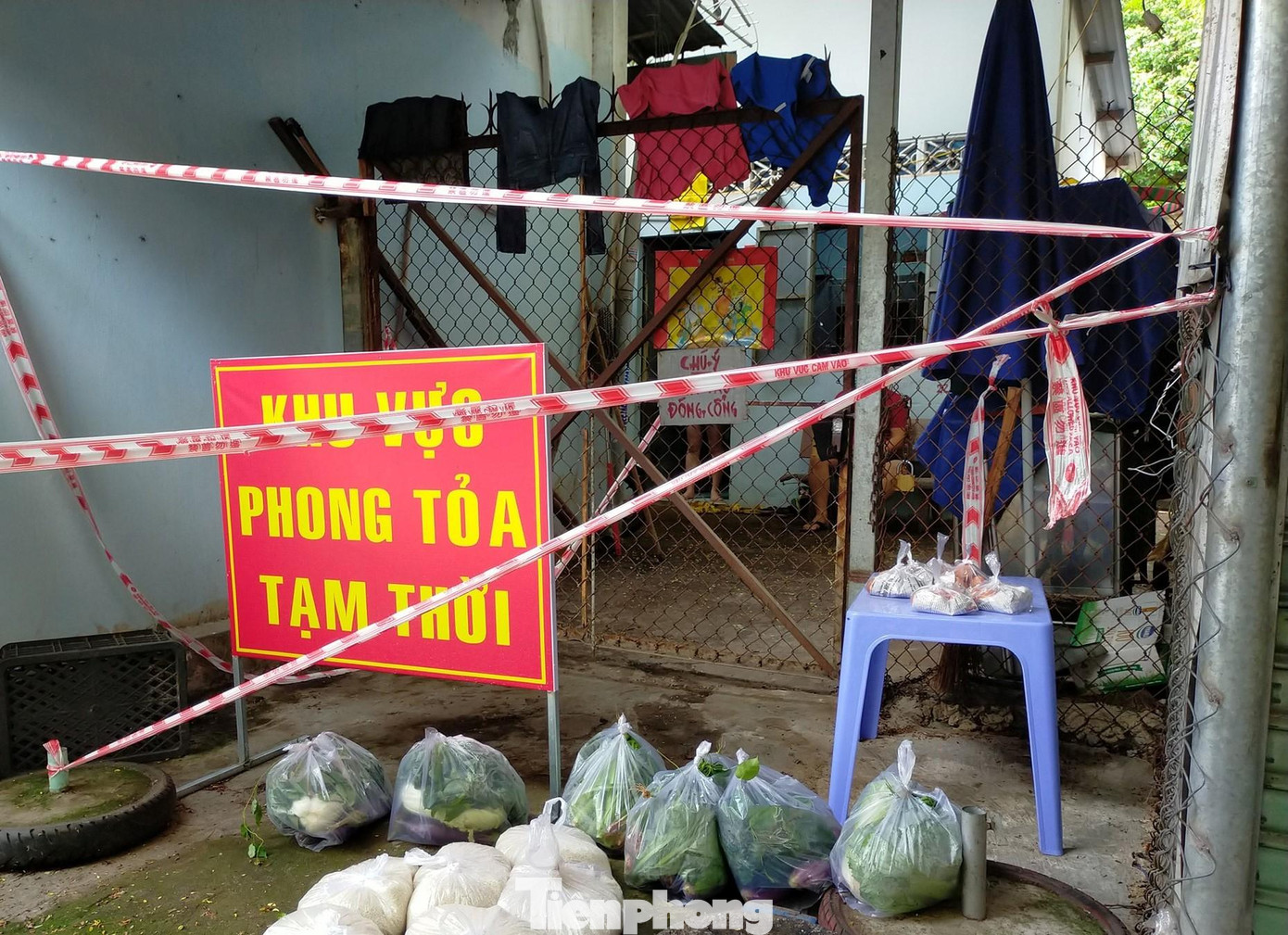 | Ở các khu nhà trọ và nhà dân, đoàn thanh niên, quân sự, công an và lực lượng khác đến tận nơi phát lương thực. Để an toàn, những người làm nhiệm vụ mang lương thực đến để trước cổng nhà và khu trọ hạn chế tiếp xúc. |