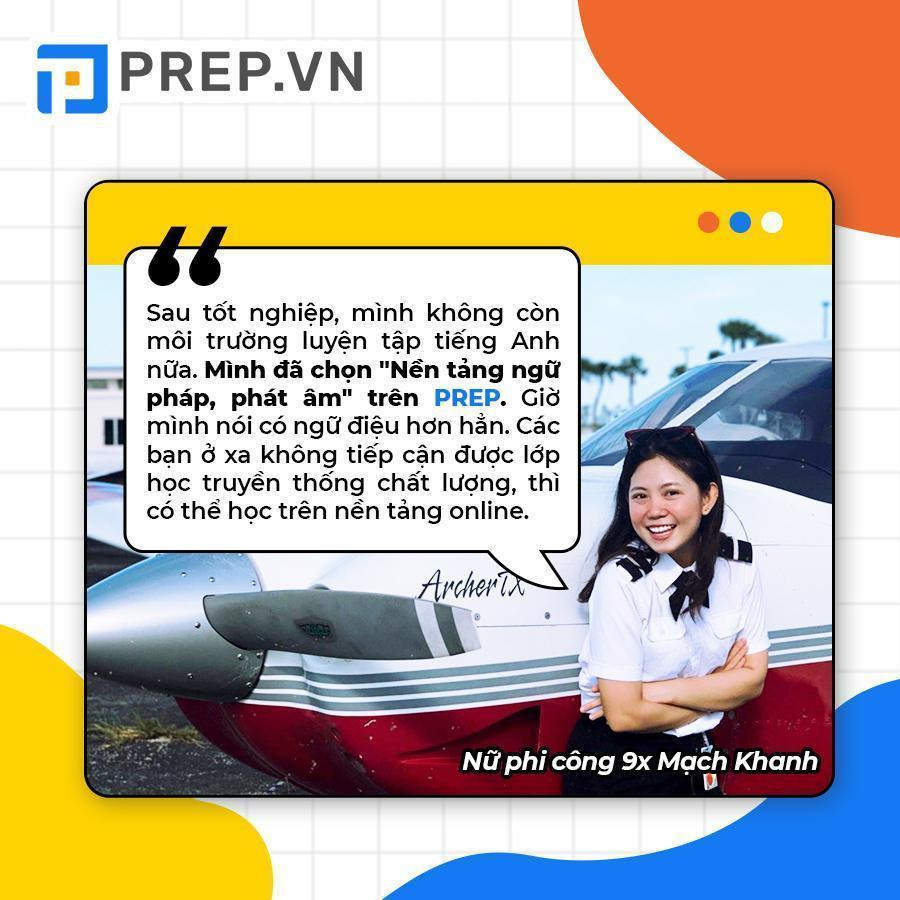 Nữ phi công 9X Mạch Khanh (kênh Youtube: from khanh) thì háo hức tiết lộ cách cô luyện nói tiếng Anh: "Sau tốt nghiệp, mình không còn môi trường luyện tập tiếng Anh nữa. Mình đã chọn "Nền tảng ngữ pháp, phát âm" trên PREP. Nghe thầy cô phát âm từ nào ra từ đó mà sướng hết cả tai. Giờ mình nói có ngữ điệu hơn hẳn. Học có lộ trình: từ nắm chắc nền tảng, tới lớp Pre-IELTS, sau đó là IELTS chuyên sâu để còn được điểm cao nữa chứ! Các bạn ở xa không tiếp cận được lớp học truyền thống chất lượng, thì có thể học trên nền tảng online. Mọi người được học thử trước khi quyết định đăng ký luôn!"