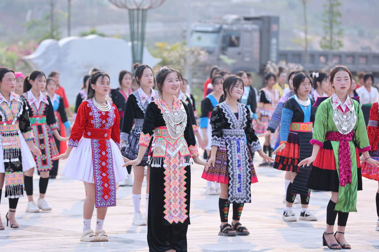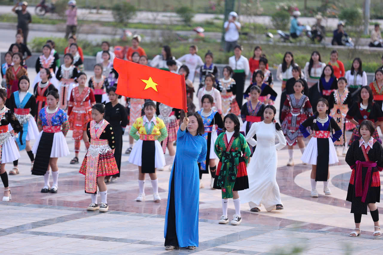 Giữa không gian lộng gió của quảng trường trung tâm huyện Nậm Pồ, hơn 200 nữ sinh Trường Phổ thông Dân tộc Nội trú THPT Nậm Pồ (Điện Biên) trong những bộ trang phục rực rỡ của các dân tộc Thái, Mông, Dao, Hà Nhì… đã cùng nhau tạo nên một màn trình diễn dân vũ mãn nhãn.