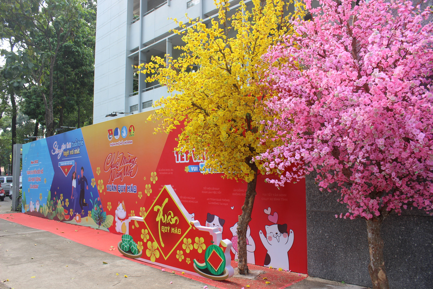 | Đối diện Nhà văn hóa Thanh niên là Thành Đoàn TP. HCM cũng rực rỡ bởi sắc vàng của hoa mai và sắc hồng của hoa đào. |