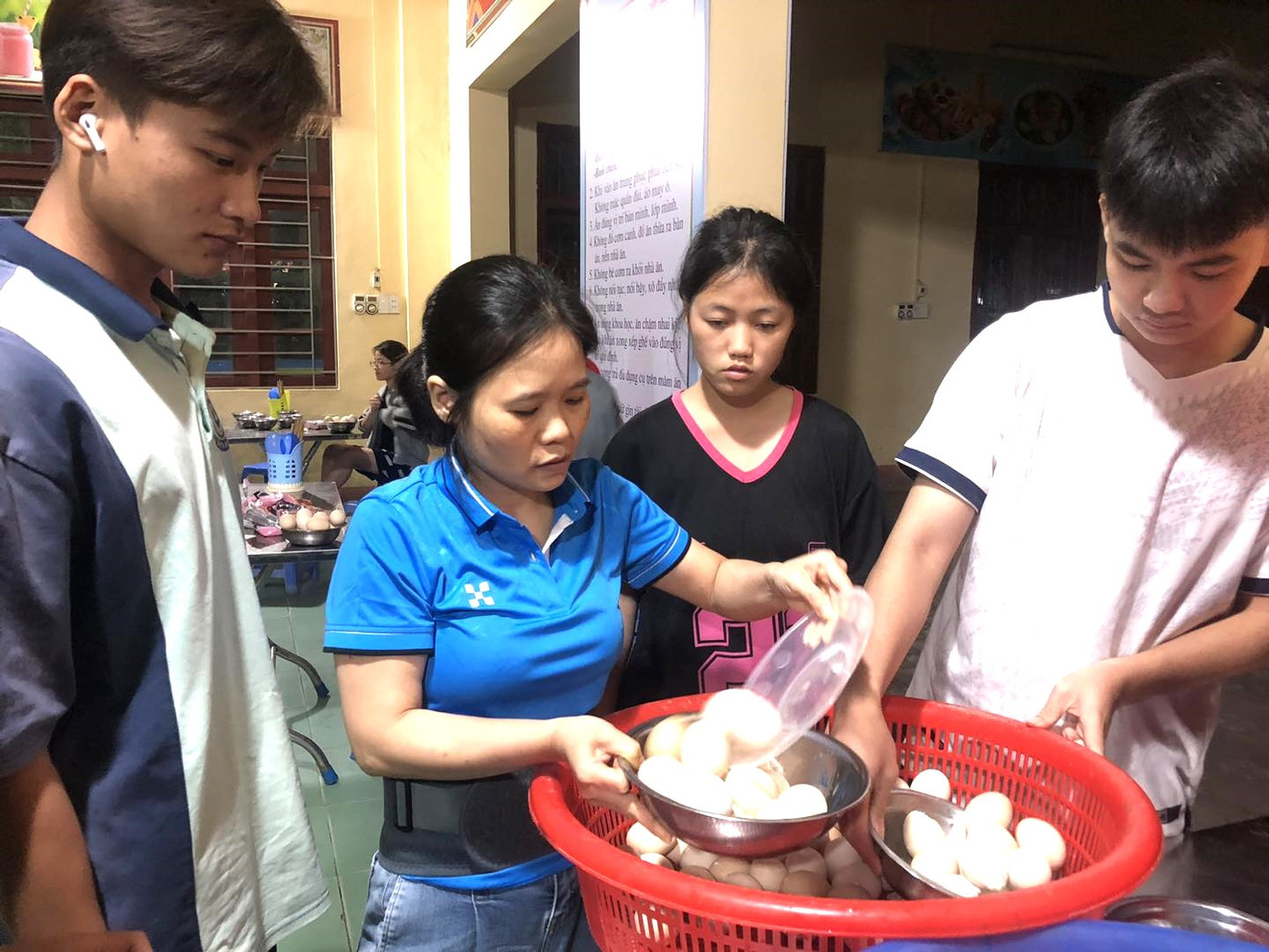Trong ánh đèn đêm của khu bán trú, đoàn viên, thầy cô giáo tất bật nhóm bếp, đun nước