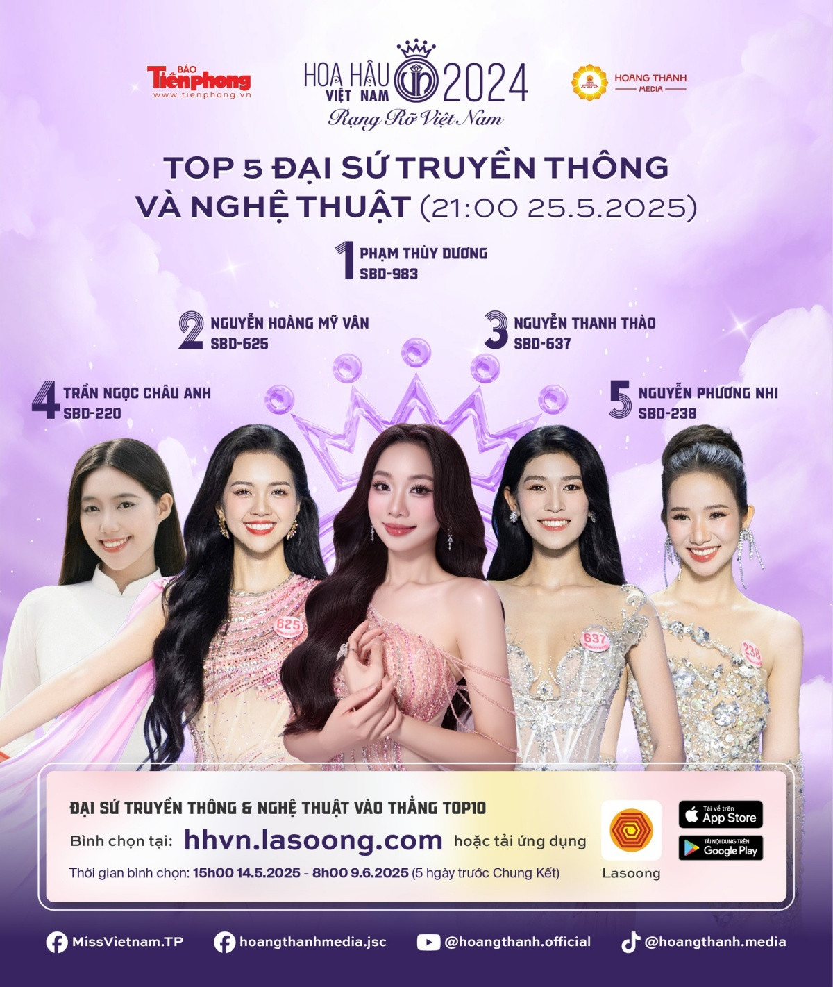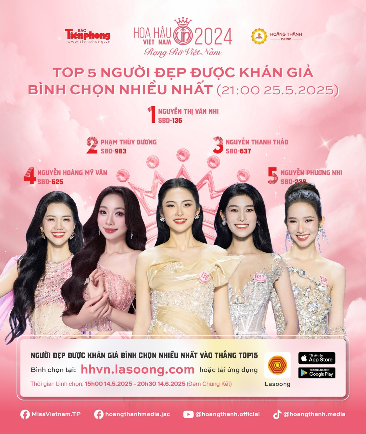 Mời bạn tiếp tục bình chọn cho hai hạng mục trên tại hhvn.lasoong.com hoặc ứng dụng Lasoong. Mỗi lượt bình chọn của bạn chính là nguồn động lực lớn để các thí sinh tiếp tục tỏa sáng. Hãy nhanh tay bình chọn để ủng hộ nhan sắc bạn yêu thích và tạo nên những bất ngờ mới ở những tuần tiếp theo!