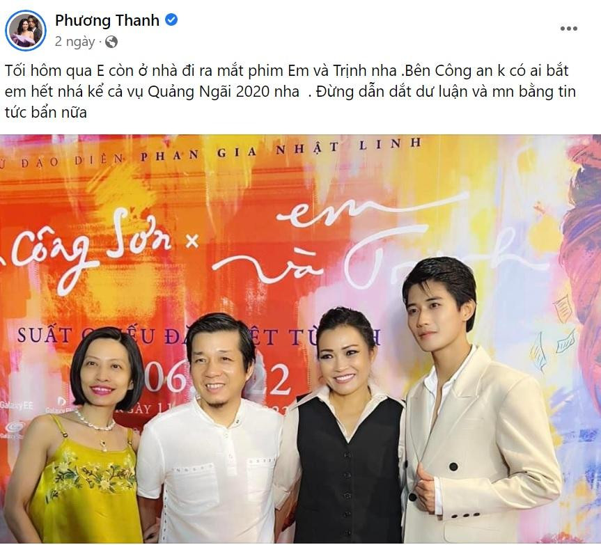 Ngay sau đó, Phương Thanh nhanh chóng đăng tải hình ảnh hiện tại của cô kèm theo lời khẳng định cô vẫn sống bình thường, không hề nhận được đề nghị nào từ các cơ quan chức năng. Nữ ca sĩ cũng nhắn nhủ khán giả hãy tỉnh táo trước những tin tức giả mạo, không có căn cứ.