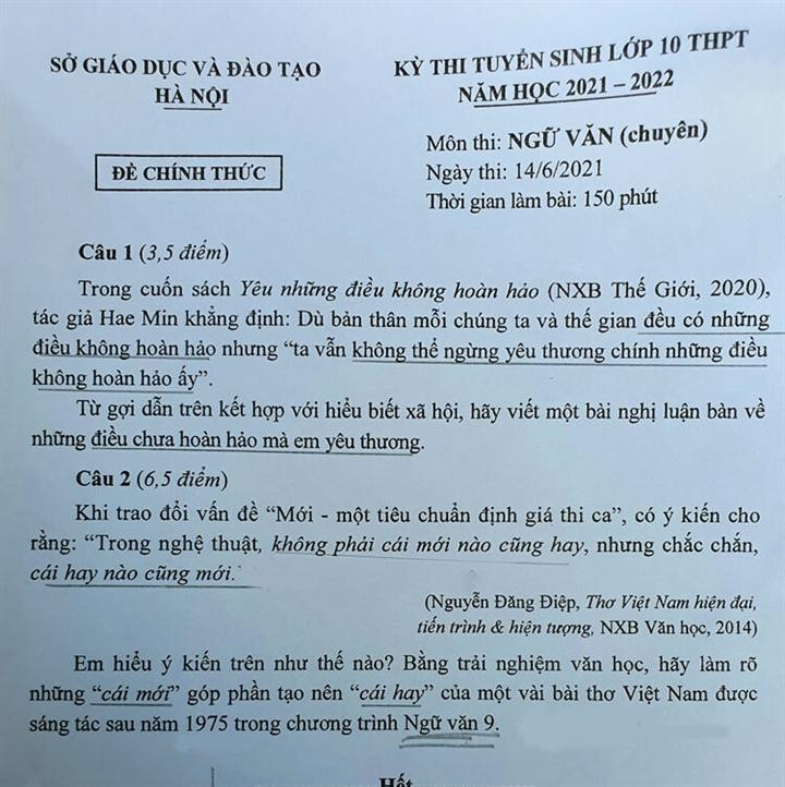 Sáng 14/6, thí sinh đăng ký nguyện vọng vào lớp 10 THPT chuyên tại Hà Nội làm bài thi môn Ngữ văn thời gian 150 phút với 2 câu hỏi tự luận. Trong đó, có một bài nghị luận yêu cầu học sinh bàn về "những điều hoàn hảo mà em yêu thương".