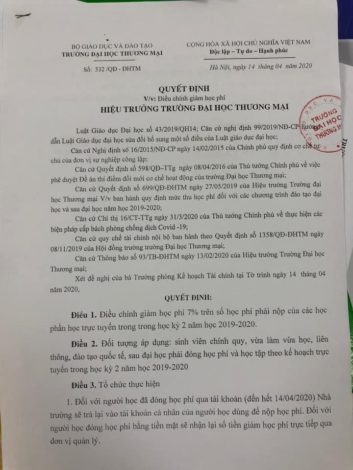 Theo đó, Nhà trường điều chỉnh giảm 7% trên số học phí phải nộp của các học phần học trực tuyến trong học kỳ II năm 2019-2020 đối với sinh viên chính quy, vừa làm vừa học, liên thông, đào tạo quốc tế, sau đại học phải đóng học phí và học tập theo kế hoạch trực tuyến trong kỳ II năm học 2019-2020. Đồng thời, Nhà trường cũng hỗ trợ người học trên cơ sở mức phí dịch vụ 3G bình quân chung (của các nhà mạng) cho 01 tín chỉ và số tín chỉ mà người học thực hiện trong thời gian học trực tuyến.