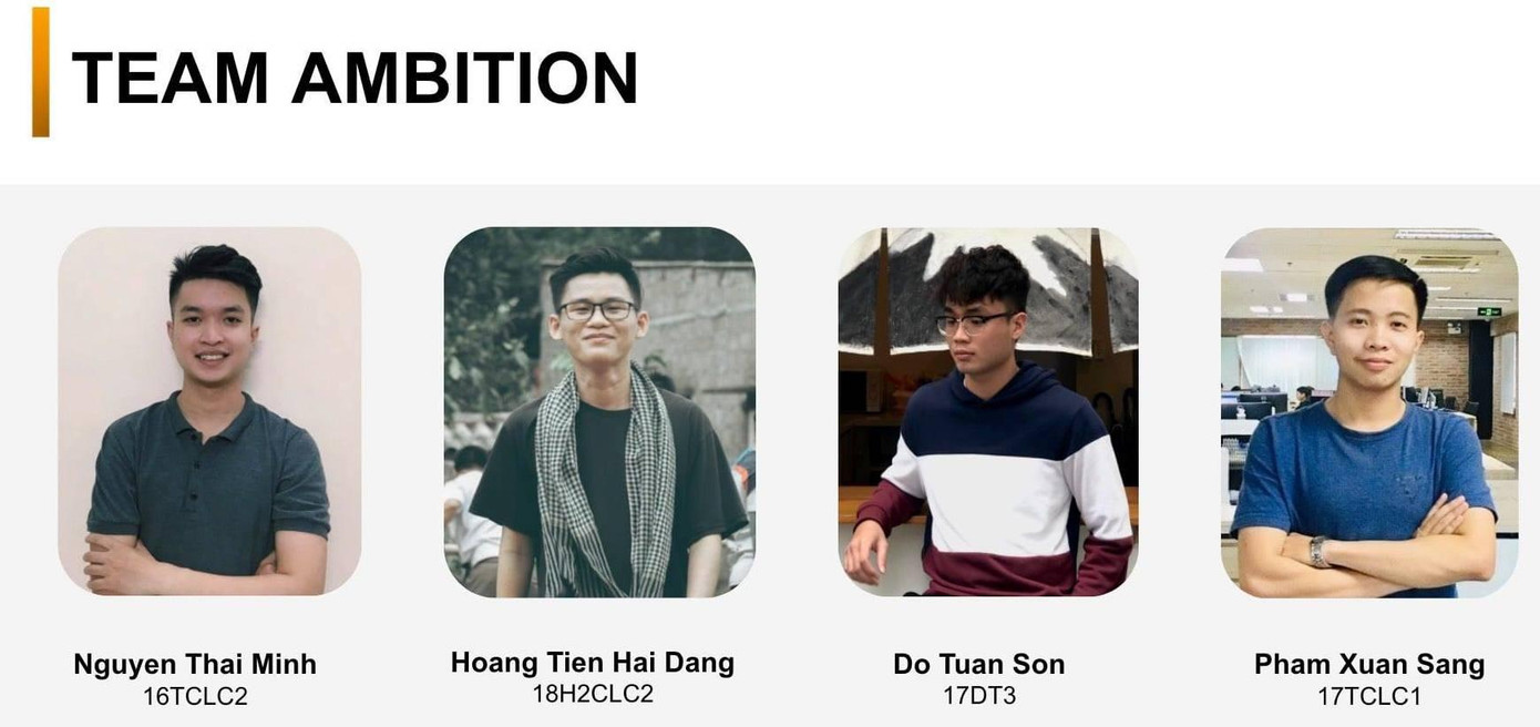 Đội tuyển Ambition gồm 4 sinh viên: Nguyễn Thái Minh, Phạm Xuân Sang, Đỗ Tuấn Sơn và Hoàng Tiến Hải Đăng đã gây ấn tượng, thuyết phục Ban Giám khảo và cộng đồng lập trình trẻ với giải pháp để vượt qua thử thách đưa ra nền tảng hữu hiệu quản lý học vụ FUED.