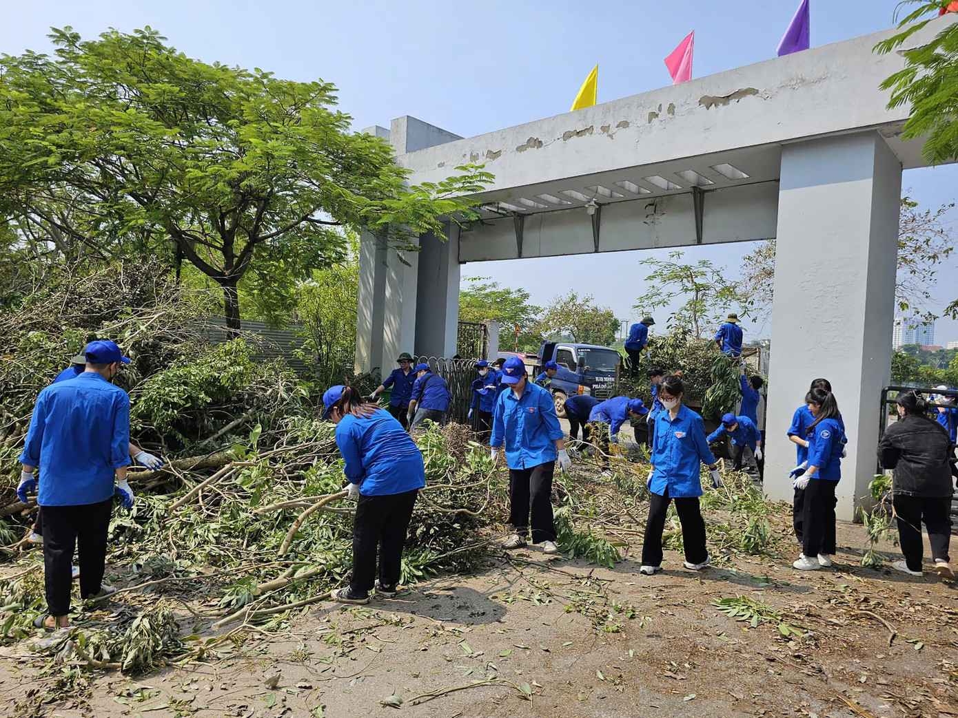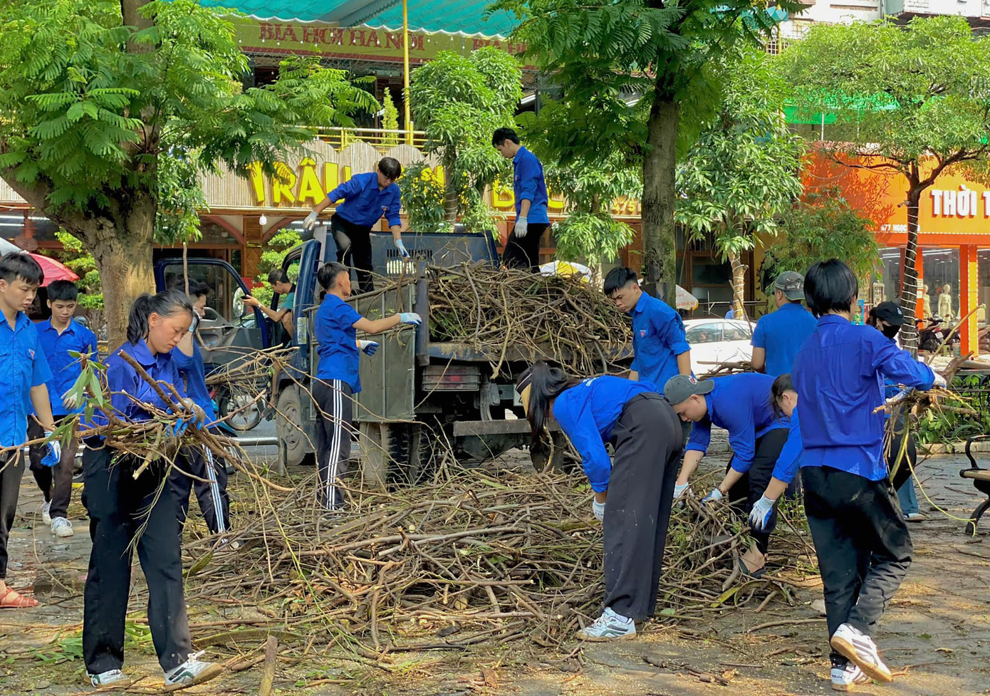 Màu áo xanh tình nguyện của đoàn viên, thanh niên, sinh viên đã phủ kín các góc phố nẻo đường trên quận Long Biên, với những hoạt động: Hỗ trợ người dân dọn dẹp cây cối đổ, quét dọn đường phố, thu gom rác, vận chuyển phế liệu...