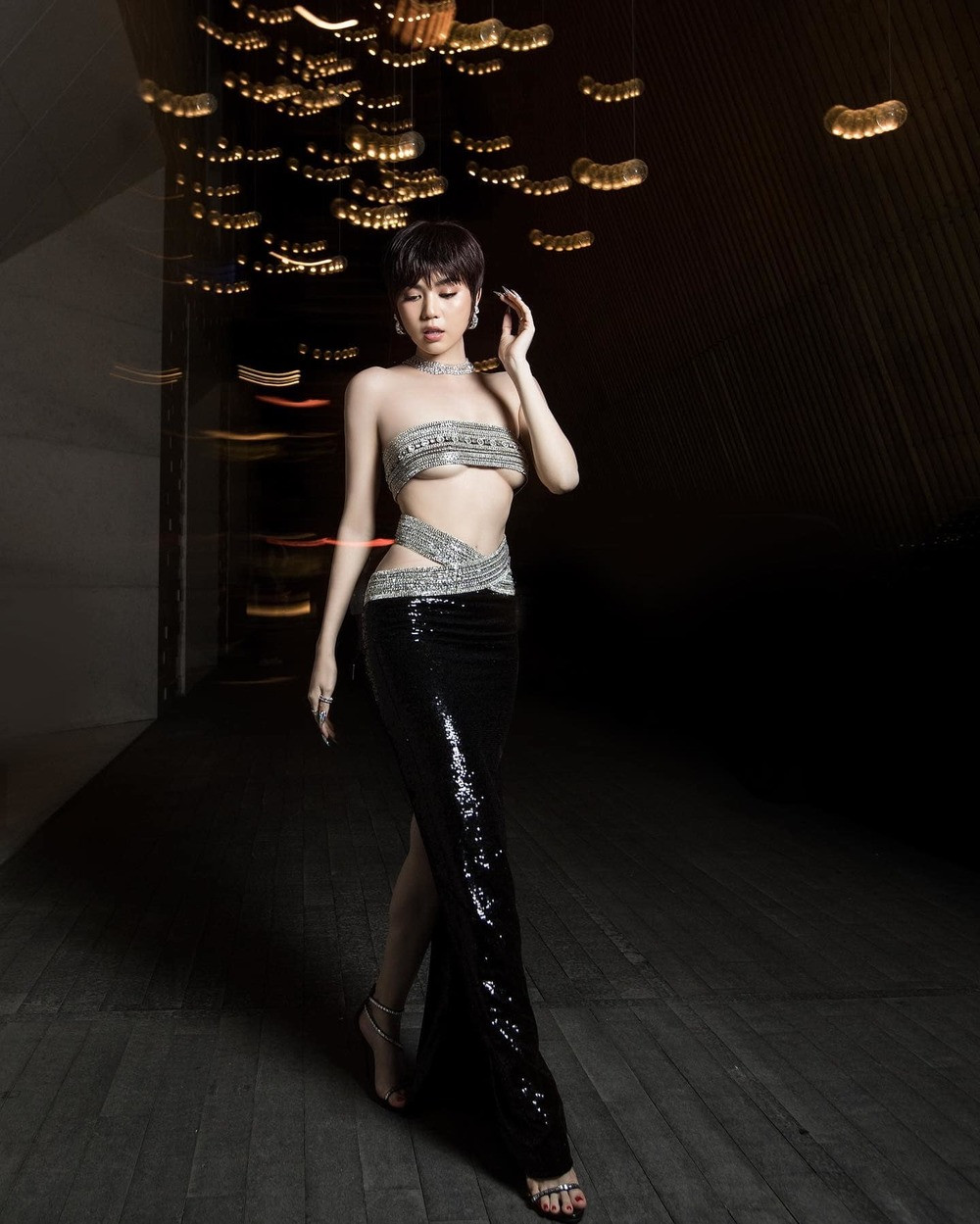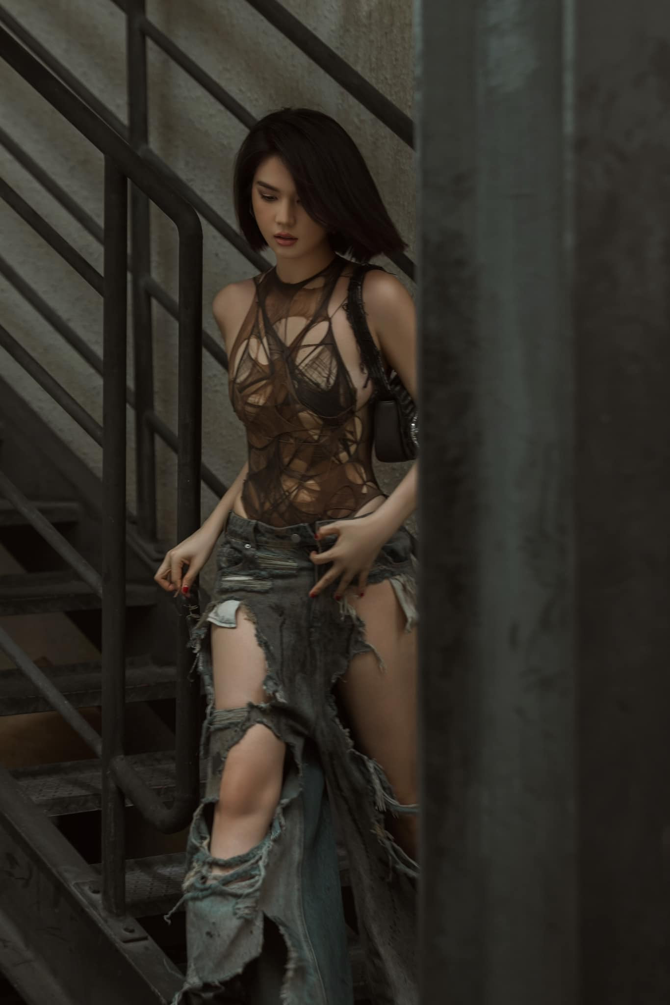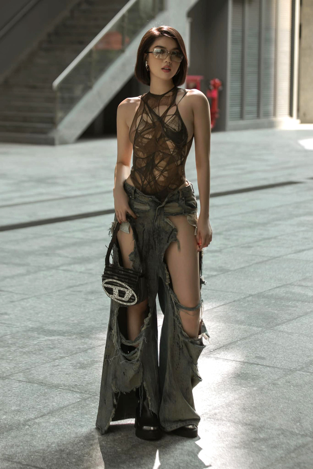 Ngọc Trinh khoe dáng trong set đồ vô cùng te tua. Chiếc áo nhiều lớp nhưng lại khoét lỗ lớn để lộ phần lớn cơ thể, chất liệu xuyên thấu thậm chí còn không đủ che cả nội y lấp ló. Đã vậy, chiếc quần mà Ngọc Trinh mặc rách tả tơi không kém, mang tiếng là mặc quần dài nhưng đôi chân của cô đã để hở toàn bộ.
