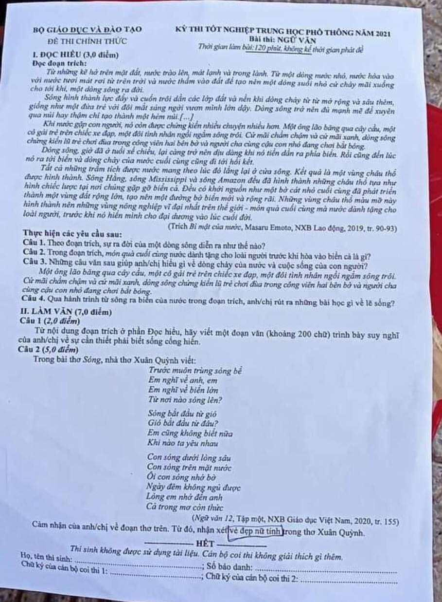 Ở phần Đọc hiểu, đề thi đưa ra câu chuyện "Bí mật của nước”, nói về "vòng đời" của một dòng sông, bắt nguồn từ những mạch nước nhỏ cho đến chảy xuôi ra biển và để lại trầm tích, hình thành nên châu thổ màu mỡ. Từ đó, các thí sinh phải trả lời 4 câu hỏi liên quan đến nội dung đoạn trích như xác định phương thức biểu đạt hay viết đoạn văn nghị luận rút ra bài học về lẽ sống.